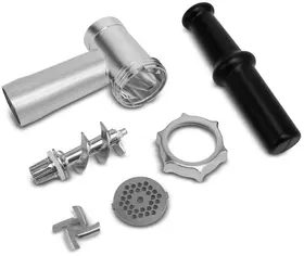 комплектация: мясорубка, головка мясорубки в сборе (с установленным шнеком, ножом, решёткой и гайкой), толкатель, лоток для продуктов, инструкция по эксплуатации; материал лотка: пластик