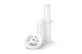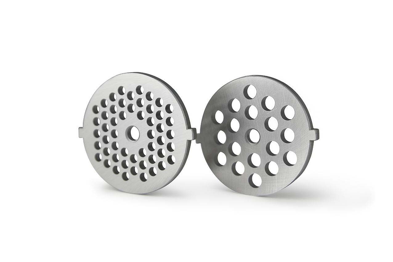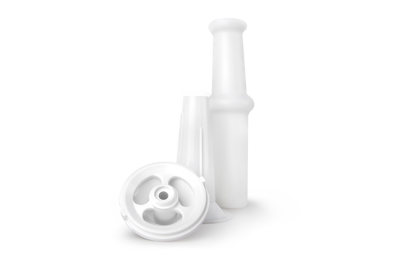 В комплект прилагаются руководство по эксплуатации, две решётки для мясорубки с пропускными отверстиями 5 и 8 мм., пластиковый толкатель, насадка для сосисок и насадка «КЕББЕ».