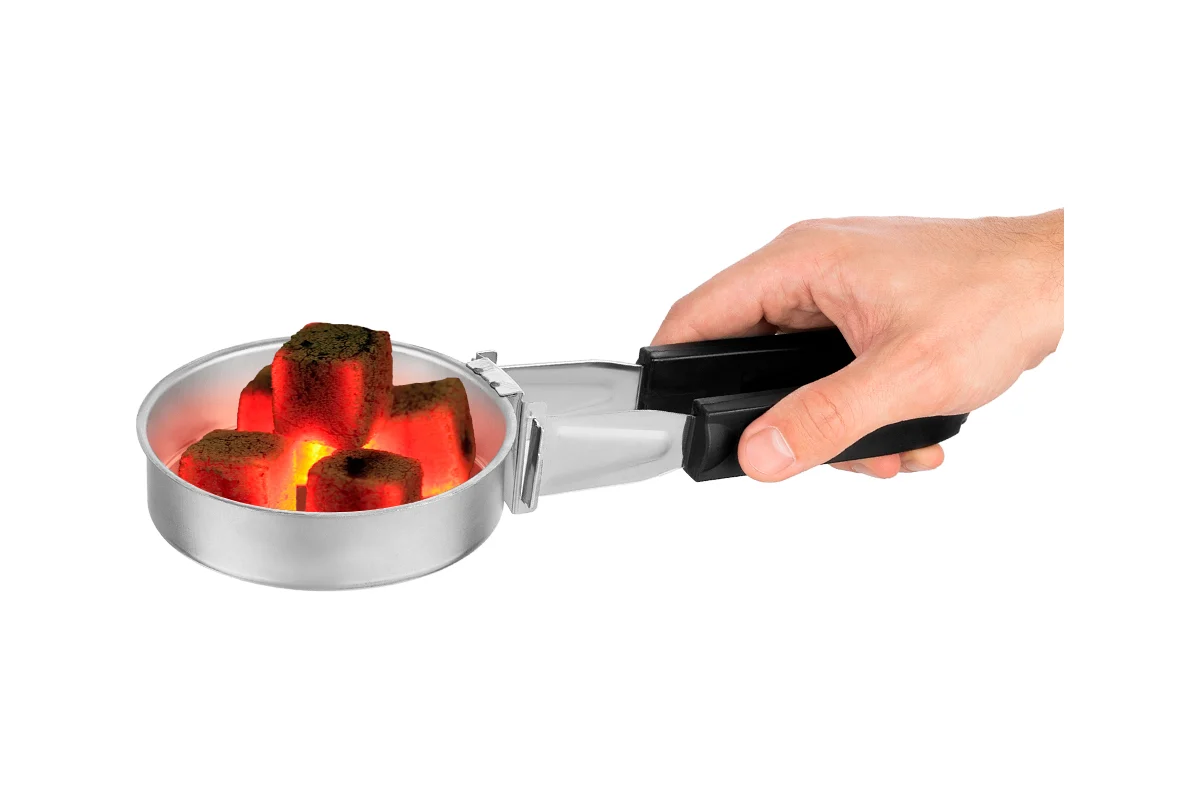Ручка плиты для розжига углей длинная и не нагревается, а для удобства хранения ее можно снять. Ручку можно крепить как самой плитке для розжига углей для кальяна, так и к корзине для углей. Корзина для углей съемная, поэтому вы можете по окончанию разогрева углей снять ее и перенести ближе к кальяну.
