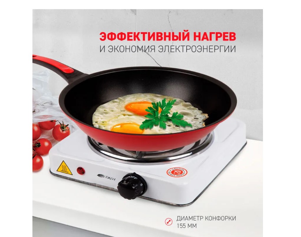 Одноконфорочная электрическая плитка СОКОЛ предназначена для приготовления и разогрева пищи в бытовых условиях. Компактный прибор снабжен световым индикатором, обозначающим включение нагревательного элемента; регулятором энергии, обеспечивающим возможность выбора оптимального режима нагрева; экраном из нержавеющей стали для более эффективного нагрева за счет отражения тепловой энергии. Во время пользования Вы с легкостью можете регулировать температуру нагрева поворотом рычага. Электроплита мощностью 1000 Вт безопасна для здоровья человека, поскольку не выделяет продуктов сгорания. Пища прогревается равномерно (конфорка не заставит долго ждать момента наслаждения вкусом готового блюда). При необходимости Вы можете снять спираль: плитку удобно чистить. Диаметр конфорки: 155 мм. Главное преимущество: возможность переноски в любое помещение с розеткой. Прибор будет полезен на маленькой кухне, в общежитии, на даче, в командировке или туристической поездке.