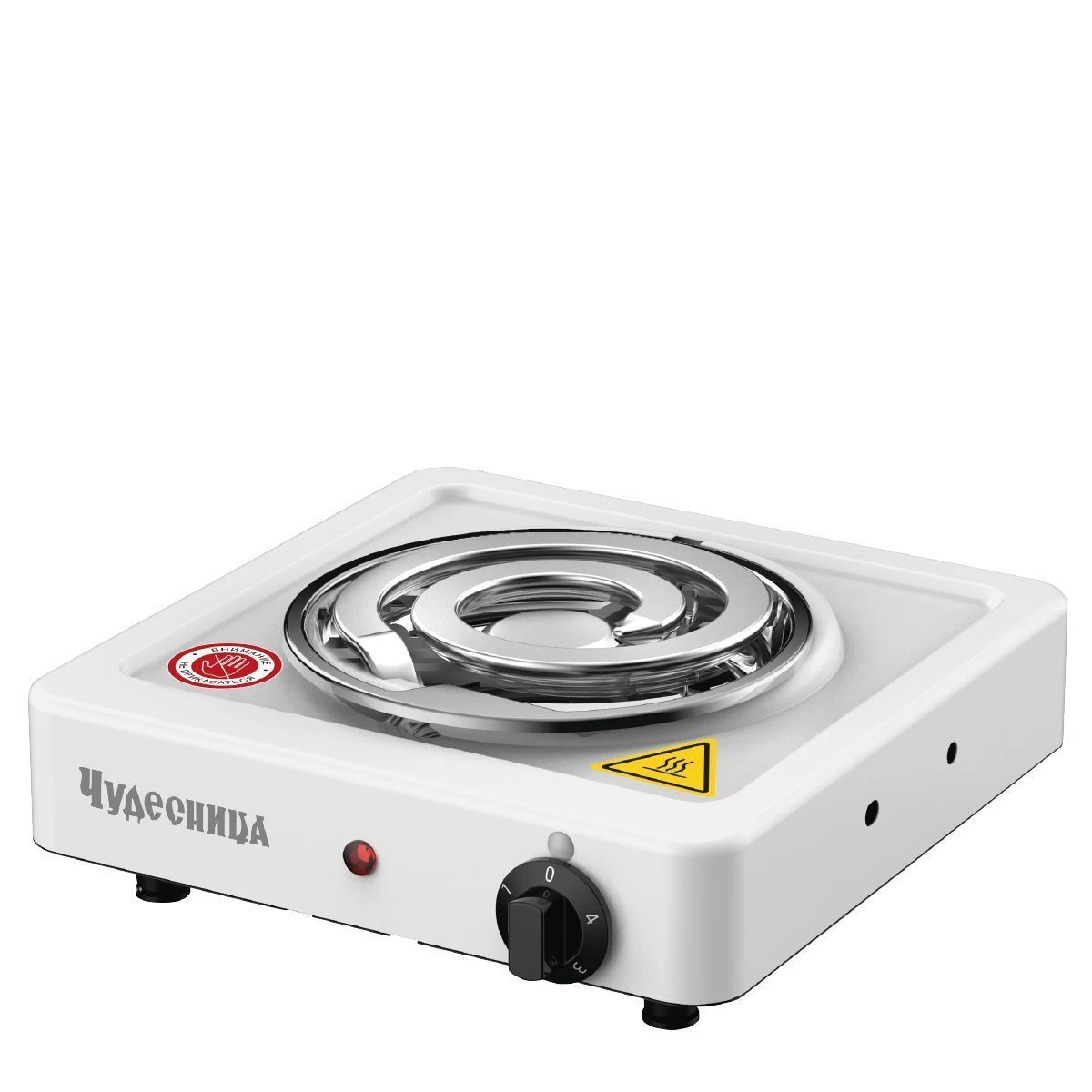 Плитка электрическая Чудесница ЭЛП-812 с 1-й конфоркой, цвет белый, мощность 1000 Вт, толстый спиральный нагревательный элемент из высококачественной стали, регулировка температуры, прочное легкоочищаемое термостойкое эмалевое покрытие, защита от перегрева, световой индикатор работы