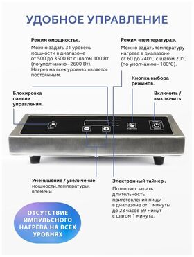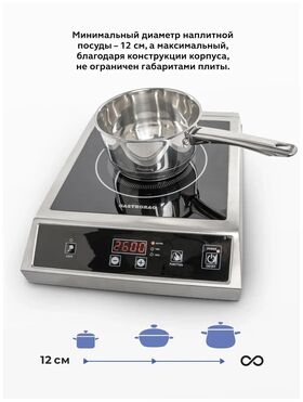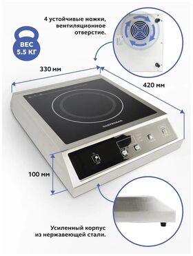 У электроплиты предусмотрена также функция блокировки панели управления - для защиты от детей и от изменения настроек в процессе приготовления. Благодаря усиленному корпусу из нержавеющей стали электроплитка выдерживает распределенную нагрузку до 100 кг. Минимальный диаметр посуды для индукции - 12 см, а максимальный, благодаря конструкции корпуса, не ограничен габаритами плиты.