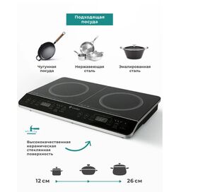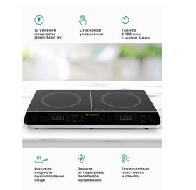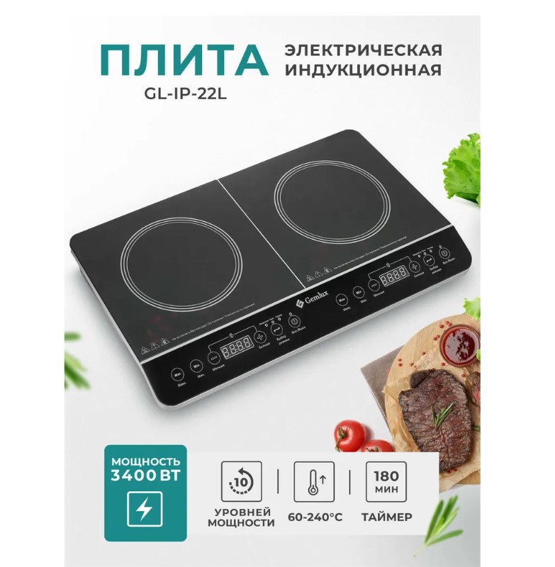 Поскольку нагревается не рабочая поверхность, а сама посуда, настольная индукционная плита работает быстрее, экономичнее и безопаснее, чем традиционная конфорочная газовая или электрическая плита. Это существенный плюс индукционной плиты. К минусам можно отнести необходимость использовать наплитную посуду только из ферромагнитных материалов (чугуна, нержавеющей и эмалированной стали) или с ферромагнитным слоем на дне. Медная, алюминиевая, стеклянная, керамическая и фарфоровая утварь для электрической индукционной плиты не годится. Кастрюли и сковороды должны иметь плоское дно диаметром 120-260 мм.Настольная индукционная плита Gemlux GL-IP-22L имеет простое и понятное сенсорное управление с несколькими режимами работы. Каждая конфорка имеет индивидуальную кнопку включения/выключения. В режиме «мощность» при помощи кнопок со стрелками задается один из предустановленных уровней мощности: для левой зоны – от 200 до 2000 Вт (по умолчанию – 1200 Вт) с шагом 200 Вт, для правой зоны – от 200 до 1400 Вт (200, 400, 600, 800, 900, 1000, 1100, 1200, 1300, 1400 Вт; по умолчанию – 1000 Вт). В режиме «температура» задается температура нагрева для каждой зоны в диапазоне 60-240оС с шагом 20оС (по умолчанию – 180оС); в режиме «таймер» – длительность приготовления пищи (от 0 до 180 минут с шагом 5 минут).