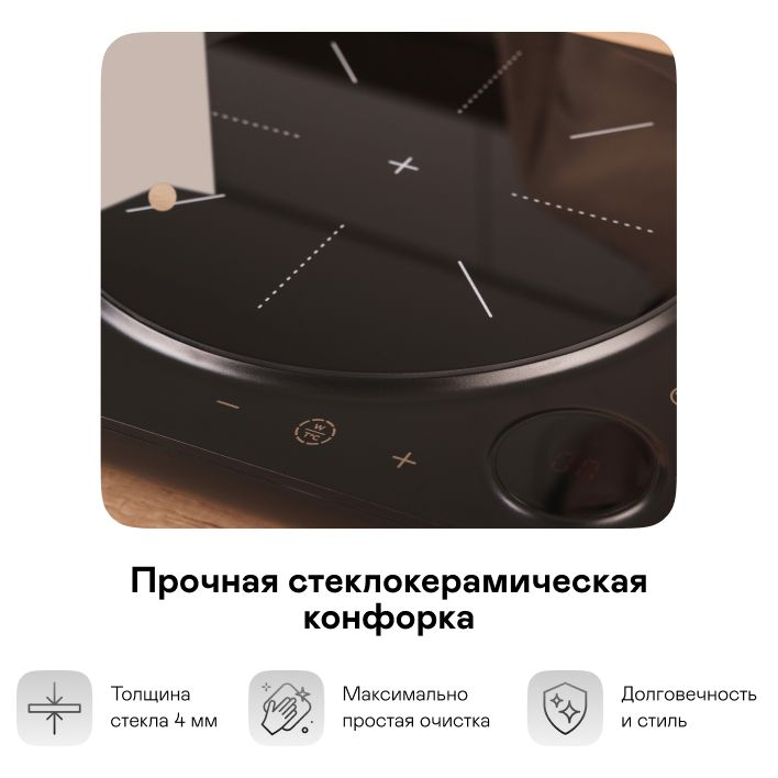 Прочная стеклокерамическая конфорка максимально проста в очистке. GARLYN H-1000 идеально подойдёт для посуды из чугуна, стали, нержавеющей стали, эмалированной стали с многослойным дном диаметром от 70 до 249 мм.