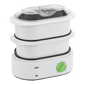 С пароваркой Braun FS3000 WH вы приготовите для всей семьи вкусные и полезные блюда без капли масла. Прибор снабжён двумя пластиковыми контейнерами, каждый объёмом 3,1 литра, что позволит вам одновременно «загружать» разные продукты. Для риса прилагается отдельная ёмкость.