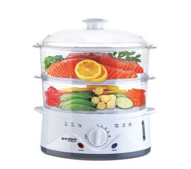 Общий объем пароварки составляет 5,5 литров и состоит из двух ярусов, что позволяет приготовить разнообразное количество блюд. А также имеет основание для воды, объемом 1 литр.