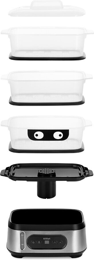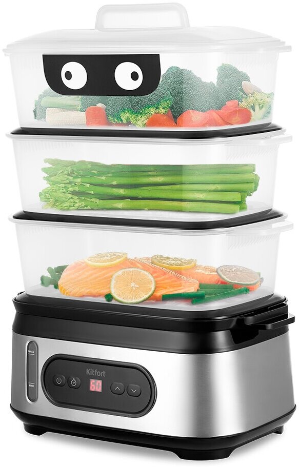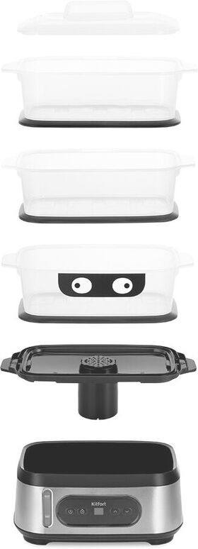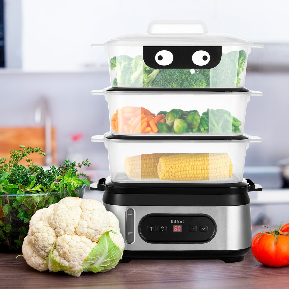 Пароварка оснащена тремя паровыми корзинами, что позволит приготовить обед или ужин из нескольких блюд сразу на всю семью. При этом пароварка достаточно компактная и не займет много места на кухонном столе.