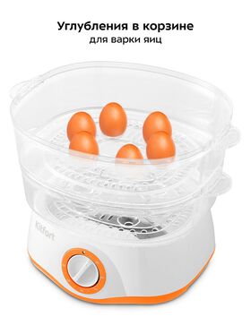 Пароварка оснащена двумя паровыми корзинами, что позволит приготовить обед или ужин из разных блюд. В паровых корзинах есть специальные отверстия, в которые удобно ставить яйца при их варке.