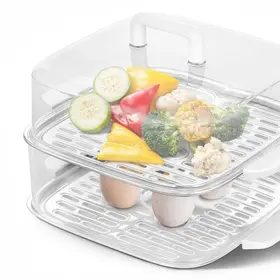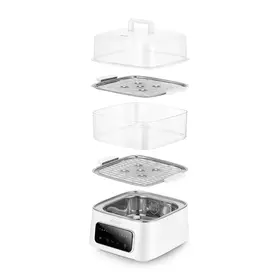 Пароварка оснащена паровым отсеком и крышкой с ручкой. У прибора также есть два специальных основания, с помощью которых вы сможете разделить пароварку на секции. За счёт этого вы можете готовить в пароварке разные продукты одновременно.