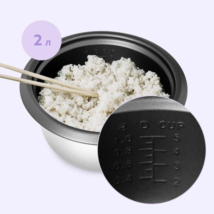 Внутри чаши нанесена мерная шкала от 1 до 5. Наполняйте чашу рисом с помощью мерного стакана, ориентируясь по шкале. Антипригарное покрытие предотвращает прилипание риса и упрощает очистку после приготовления.