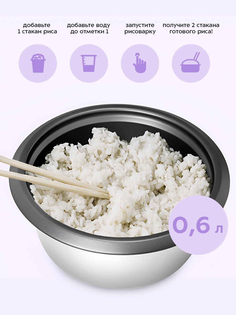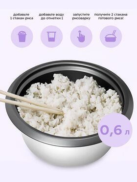 Рисоварка с антипригарным покрытием легко приготовит до шести стаканов идеально рассыпчатого риса. Просто отмерьте необходимое количество воды с помощью мерного стакана, добавьте рис и включите режим "Приготовление".