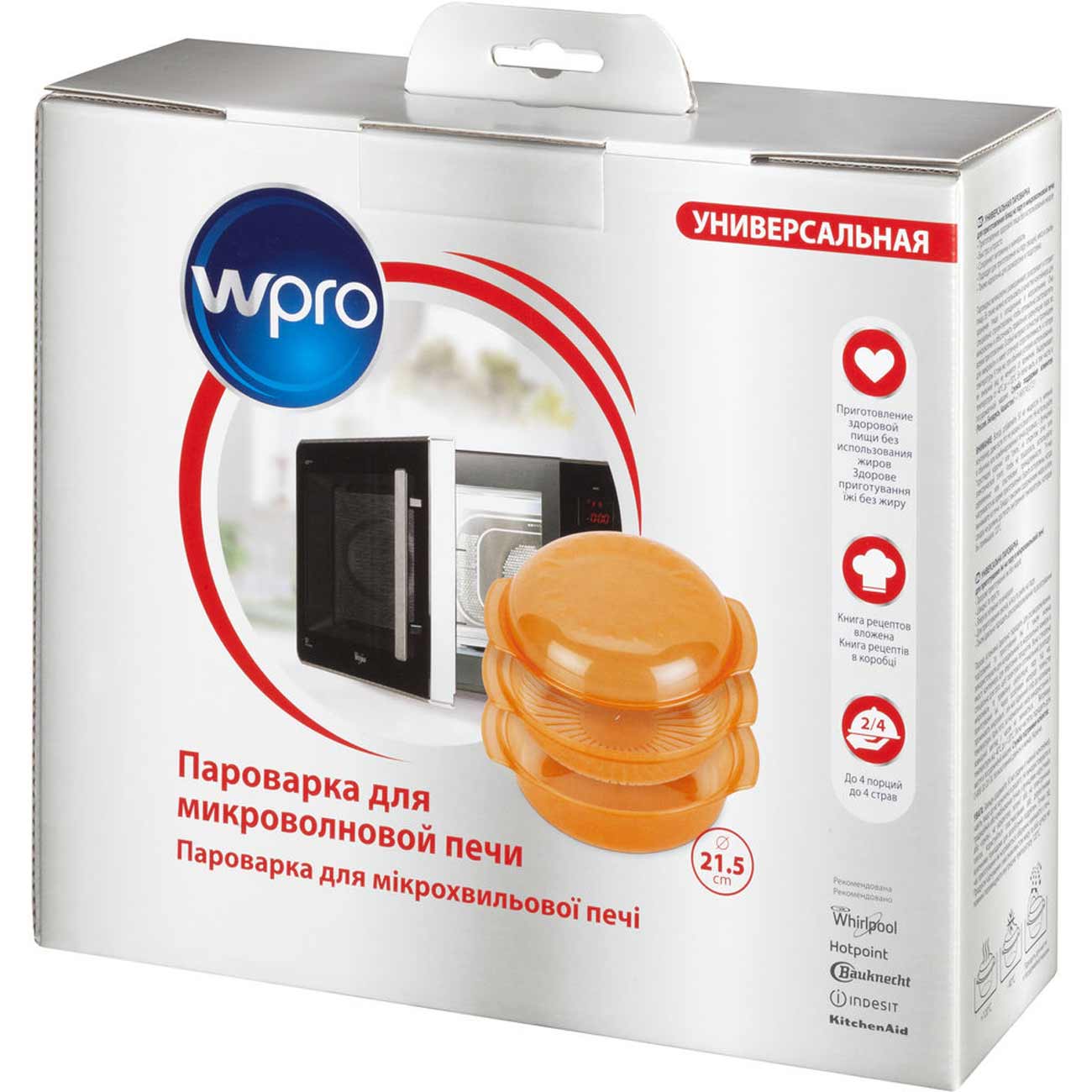 Wpro STM064 – контейнер, предназначенный для приготовления блюд на пару в микроволновой печи, хороший выбор для всех приверженцев здорового питания. Приспособление состоит из трёх частей: ёмкости, куда наливается жидкость или бульон, решётки, на которую выкладываются продукты, и крышки.