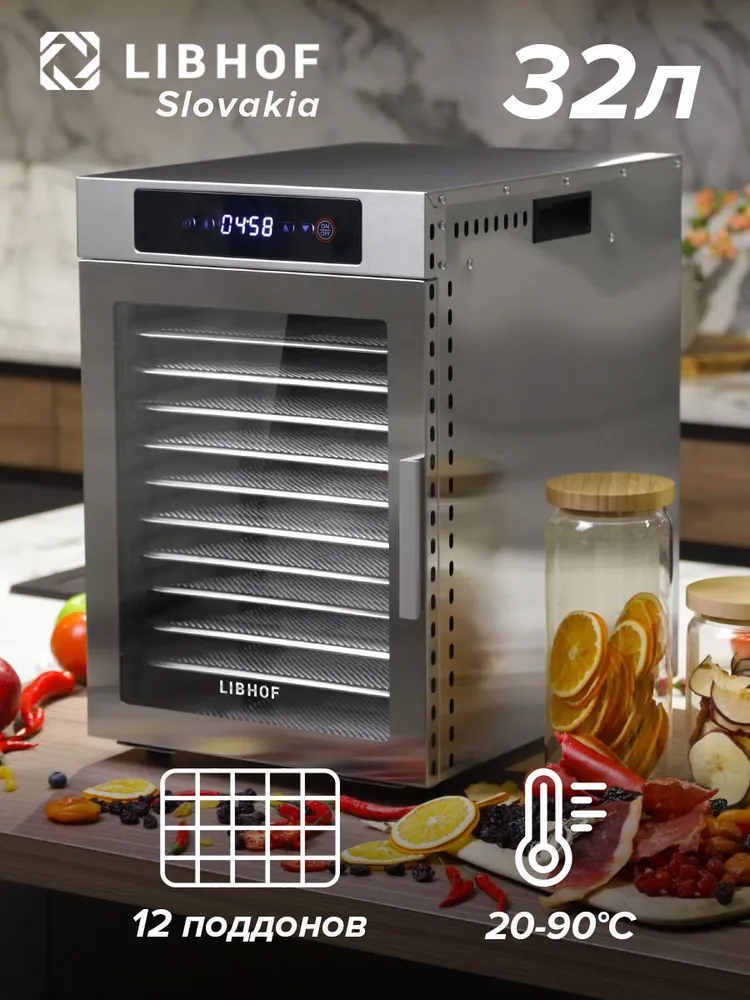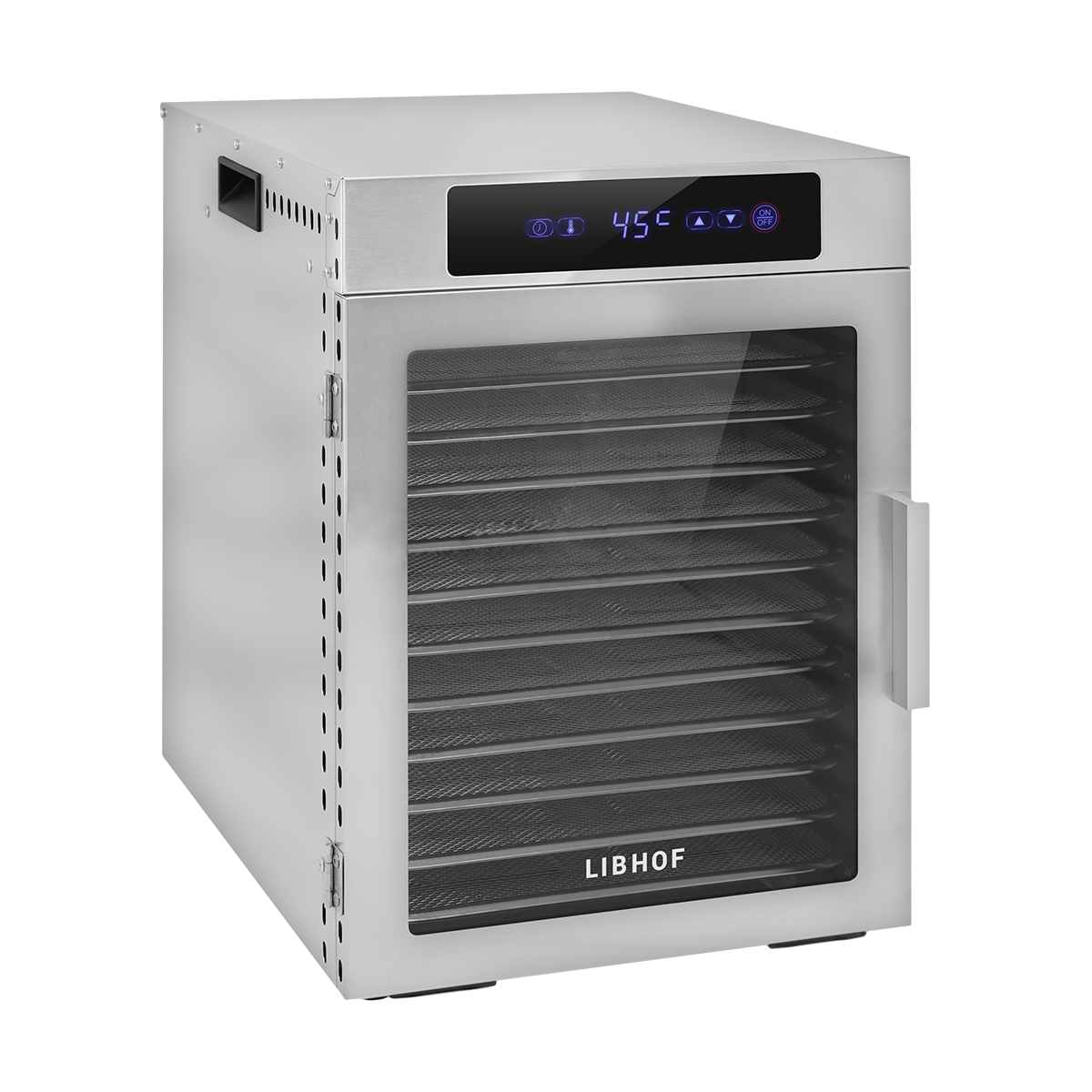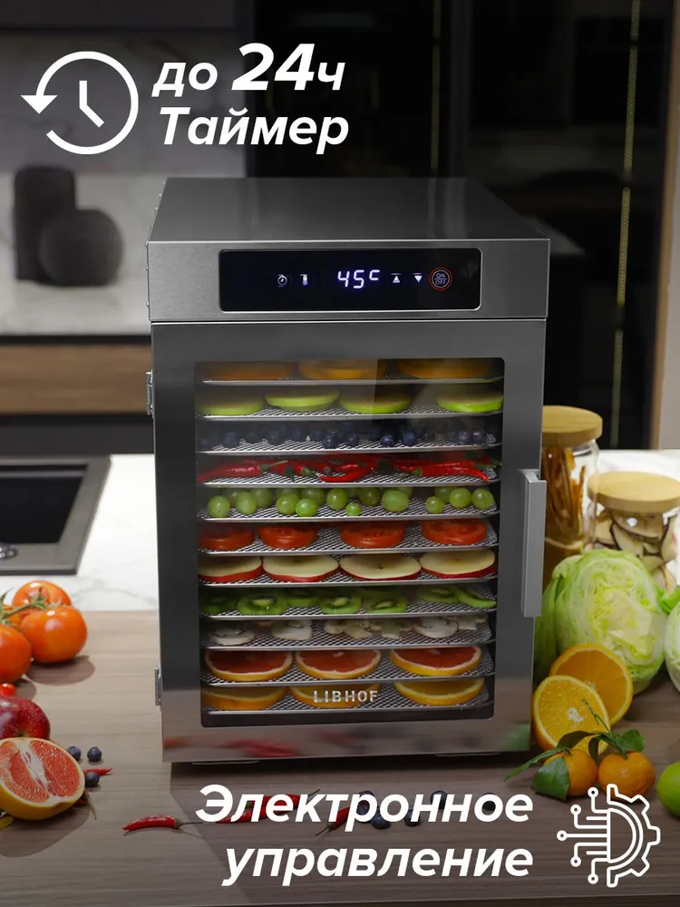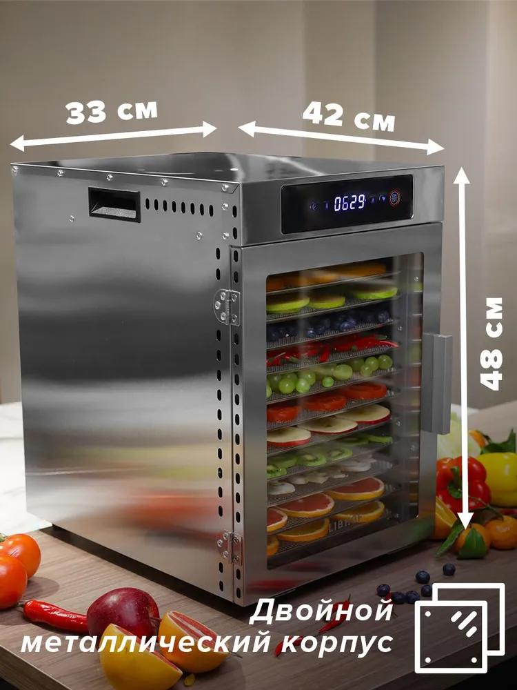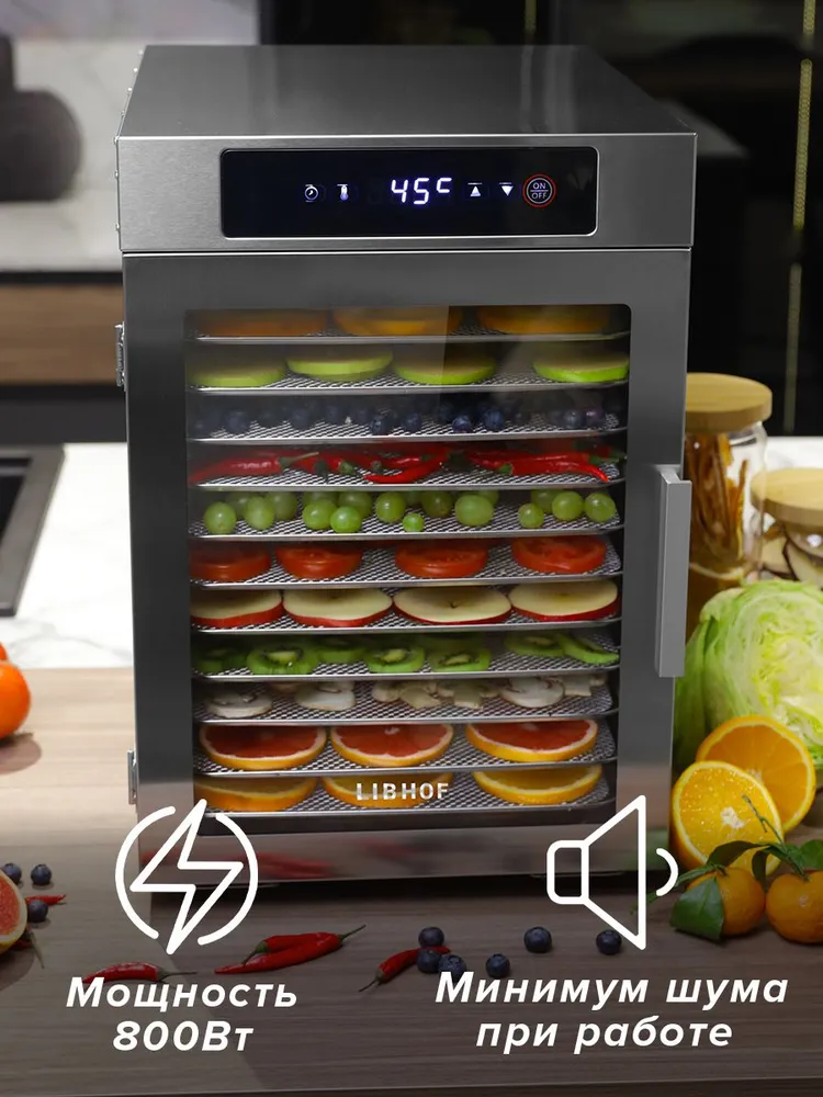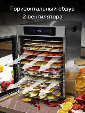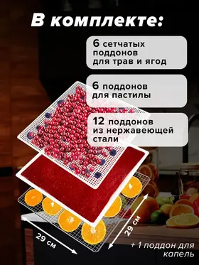 дегидратор – 1 шт, инструкция по эксплуатации, книга рецептов, лоток для пастилы – 6 шт, лоток для сбора капель – 1 шт, мелкоячеистая сетка – 6 шт, поддон из нержавеющей стали – 12 шт