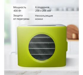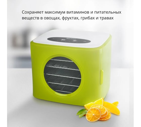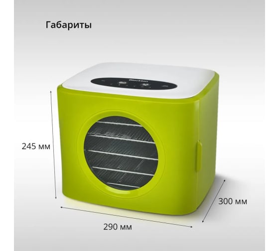 Рабочий объем устройства – 9 л, что позволяет сушить значительное количество продуктов одновременно. В комплектацию входит 6 поддонов из хромированного железа размером 257.5 на 206 мм с высотой 32 мм. Кроме того, к преимуществам устройства относятся встроенная защита от перегрева и противоскользящие ножки.