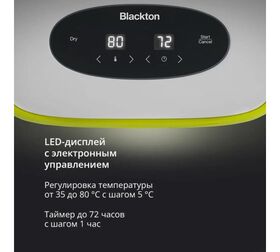 Модель дегидратора Blackton Bt FD1113 имеет температурный диапазон от 35 до 80 °С с шагом в 5°С и таймер от 1 до 72 часов с шагом в 1 час. LED дисплей делает управление прибором комфортным и интуитивно понятным.