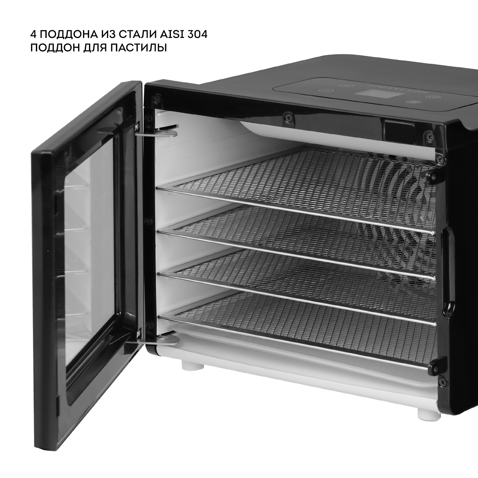4 поддона из стали AISI 304 размером 23,6*18,1 см и поддон для пастилы позволяют сушить несколько различных продуктов одновременно.
