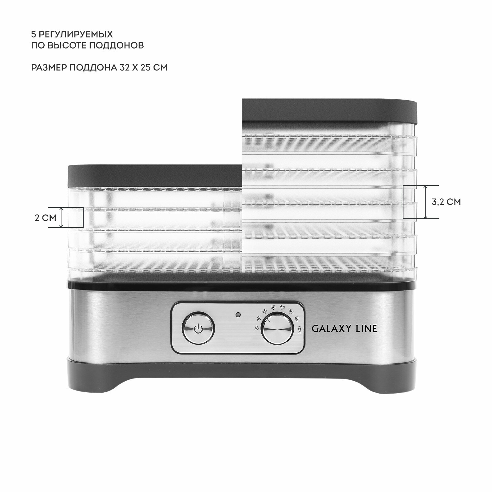 5 регулируемых по высоте съемных секций позволяют разместить в небольшом объеме максимум продуктов и добиться их наилучшего распределения для быстрого и равномерного высушивания.