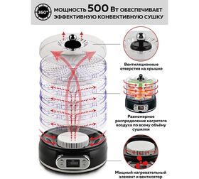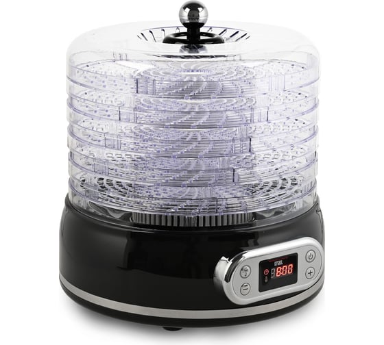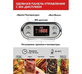 Сушилка оборудована вентилятором для циркуляции воздуха и нагревателем с контролем температуры. Электрический дегидратор рассчитана на продолжительный режим работы до 72 часов подряд. Можно установить температуру сушки в диапазоне 35-70°С. ЖК-дисплей покажет установленную температуру и оставшееся время работы электросушилки.