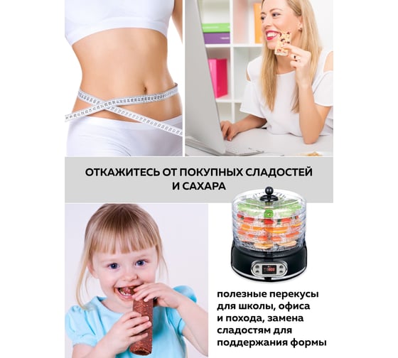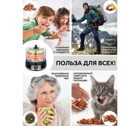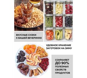 Благодаря оптимальным размерам (30х30х28 см) сушилка для овощей и фруктов не займёт много места на кухне. Она всегда рядом, если захочется побаловать себя и членов семьи полезными и вкусными лакомствами.
