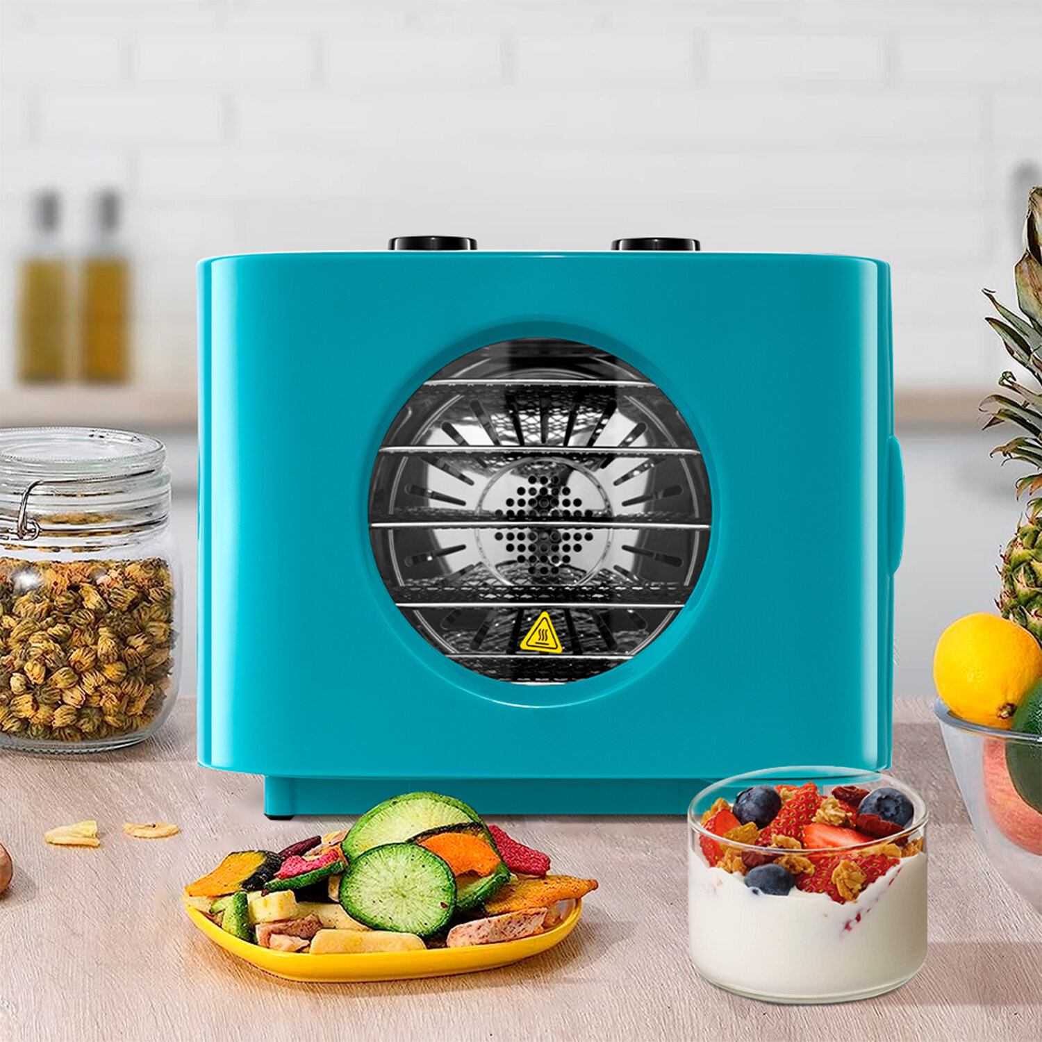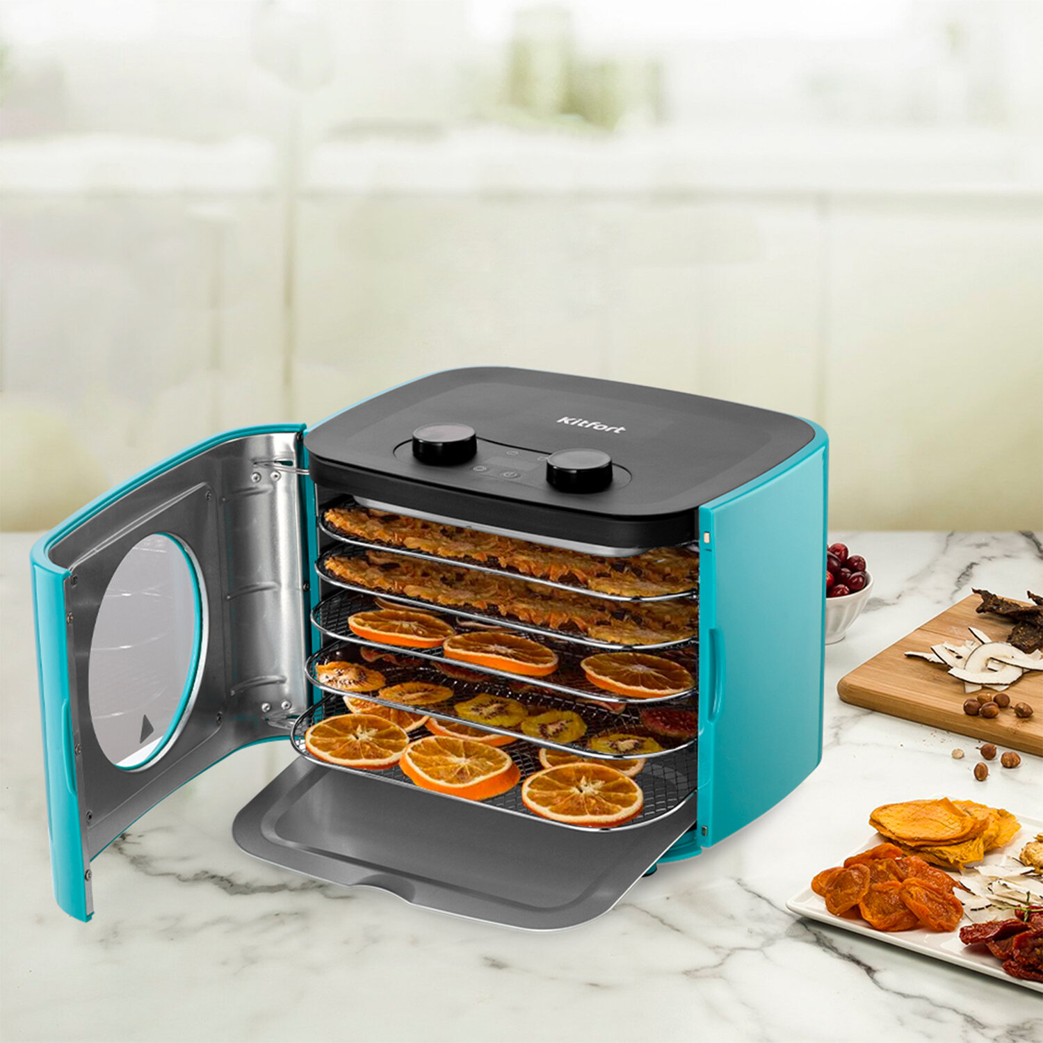 Электрическая сушилка КТ-1952 предназначена для сушки овощей, фруктов, ягод, грибов, корнеплодов, трав и зелени, а также мяса и рыбы, хлеба. В сушилке также можно приготовить йогурт.