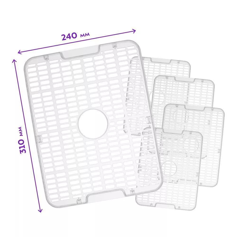 Сушилка имеет в комплекте 5 поддонов из прозрачного пластика, поэтому вы легко можете наблюдать за процессом сушки. Поддоны устанавливаются друг на друга.