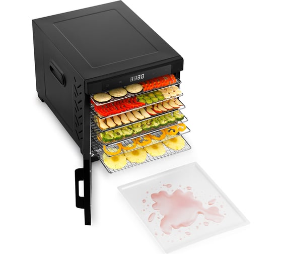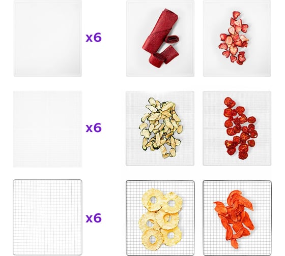 В комплекте к сушилке идут 6 металлических поддонов, 6 сеток для мелких продуктов и 6 сплошных пластиковых поддонов.