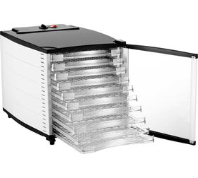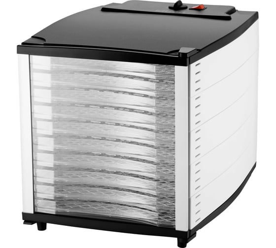 Сушилка имеет в комплекте 10 пластиковых поддонов, 10 сеток для мелких продуктов и 10 пластиковых сплошных поддонов.