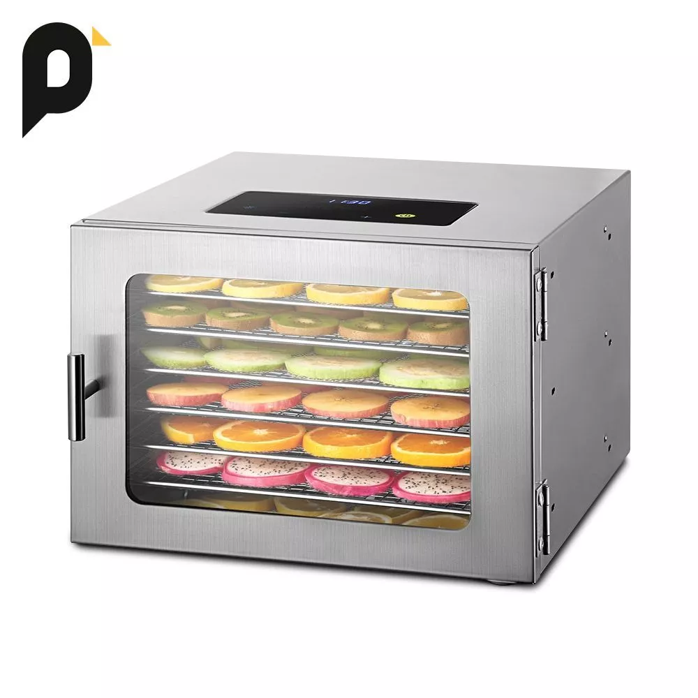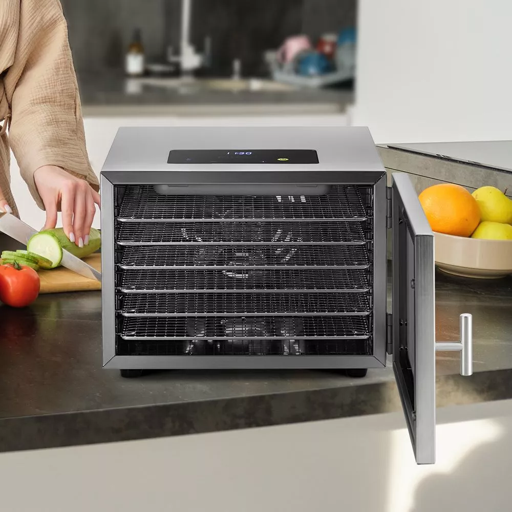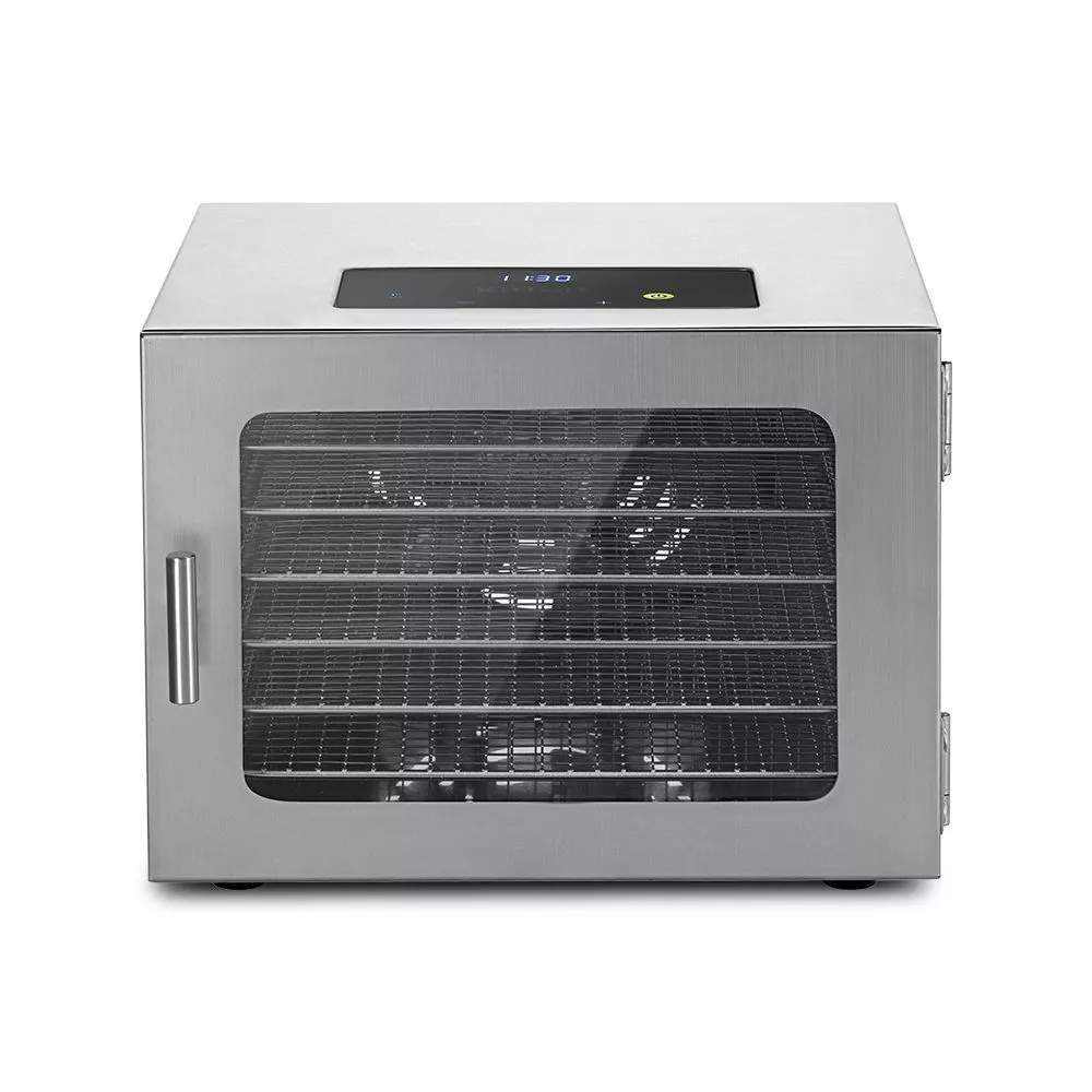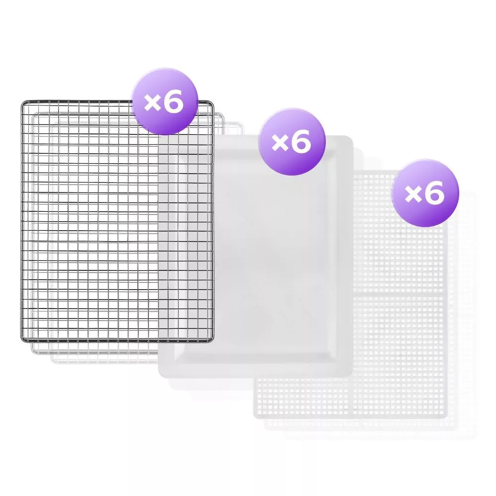 В комплекте 6 металлических поддонов, 6 сеток и 6 сплошных поддонов. Металлические поддоны подходят для большинства продуктов. Сетки используются для небольших продуктов, таких как травы и ягоды. Сплошные поддоны служат для сушки водянистых продуктов.