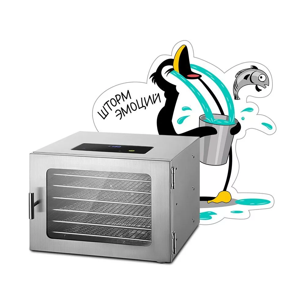 В сушилке установлен мощный нагревательный элемент и вентилятор, обеспечивающие равномерное распределение нагретого воздуха по объёму камеры. Благодаря горизонтальному обдуву смешение запахов при сушке одновременно разных продуктов минимально.