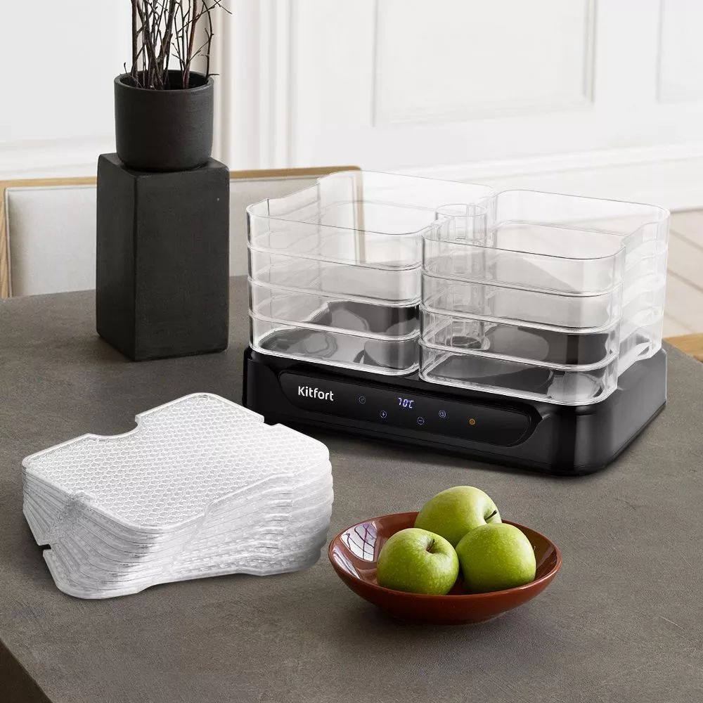 В комплекте идёт 4 сплошных поддона, 8 сетчатых поддонов и крышка. Сетчатые поддоны устанавливаются на сплошные поддоны и служат для того, чтобы излишняя влага, стекающая с продуктов, попадала на сплошной поддон.