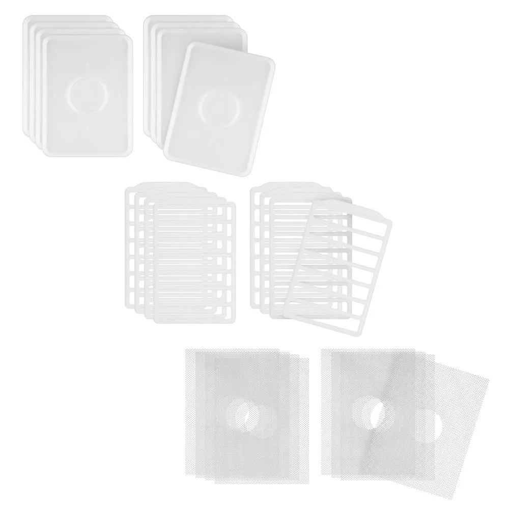 Сушилка имеет в комплекте 8 металлических поддонов, 8 сеток для мелких продуктов и 8 пластиковых сплошных поддонов. Вы можете класть один поддон на низ сушилки, чтобы сок и остатки от продуктов падали на него.