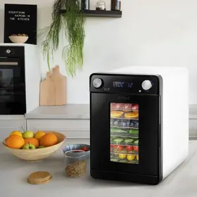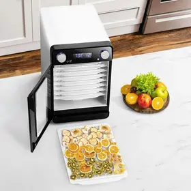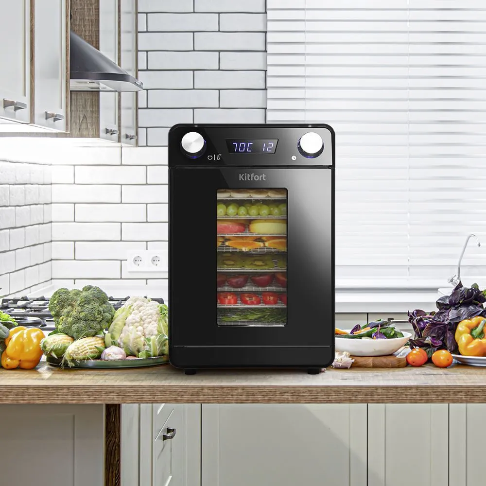 Вместительная сушилка для овощей и фруктов КТ-1981 сохранит любимые фрукты и овощи полезными круглый год! Прибор насушит на всю зиму помидоры, кабачки, баклажаны, клубнику, абрикосы, мясо, рыбу, персики, тыкву, грибы, зелень, а также хлеб.