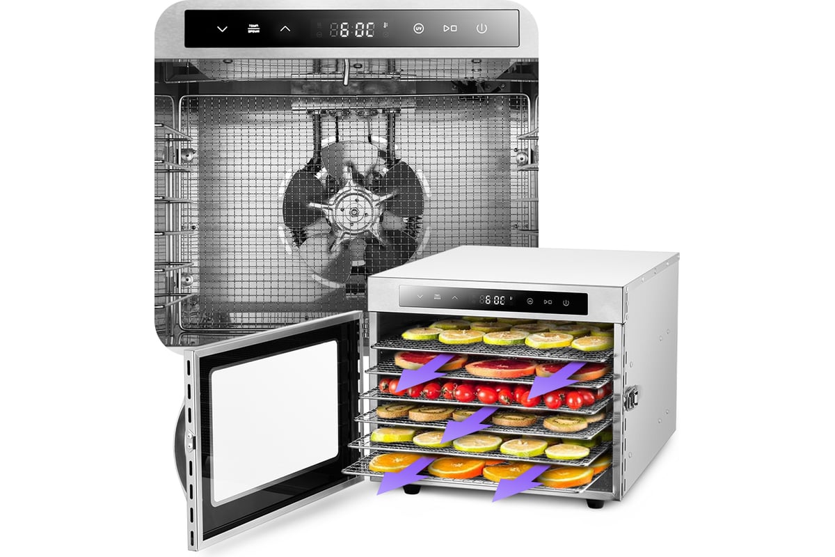 В сушилке установлен нагревательный элемент, а также вентилятор, обеспечивающий равномерное распределение нагретого воздуха по всему объему камеры. Благодаря горизонтальному обдуву смешение запахов при сушке одновременно разных продуктов минимально.