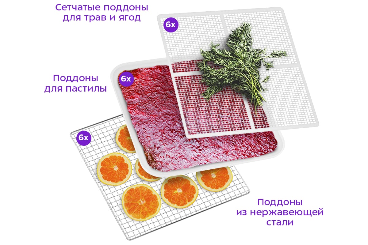 В комплект сушилки входят 6 поддонов из нержавеющей стали, 6 сеток и 6 поддонов для пастилы.