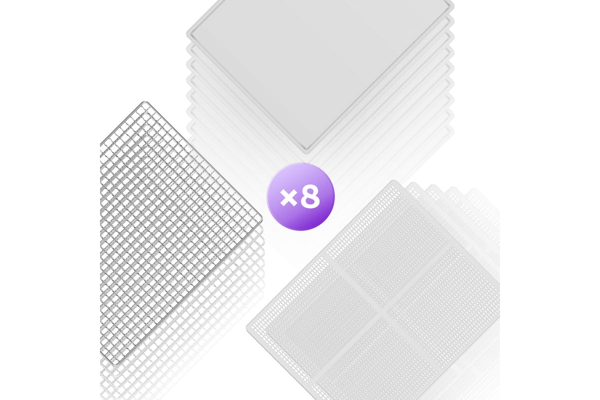В комплект сушилки входят 8 поддонов из нержавеющей стали, 8 сеток и 8 поддонов для пастилы.