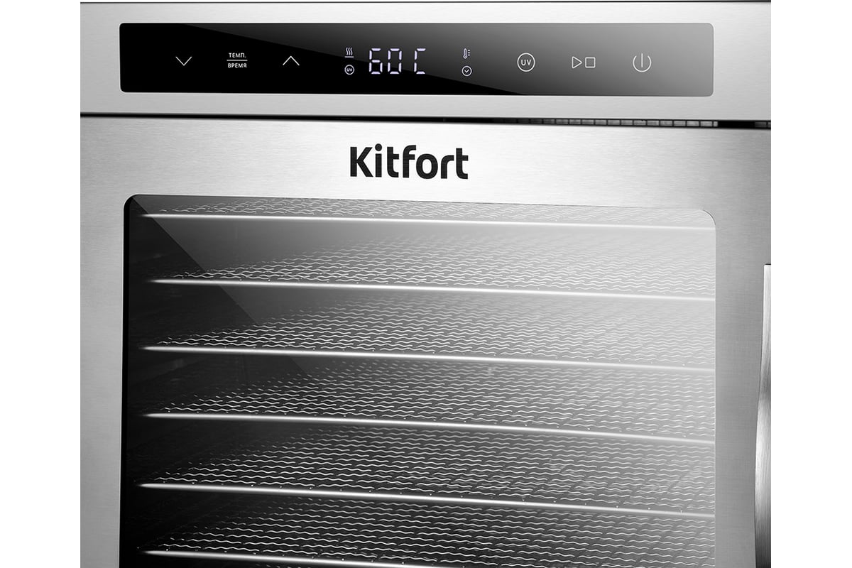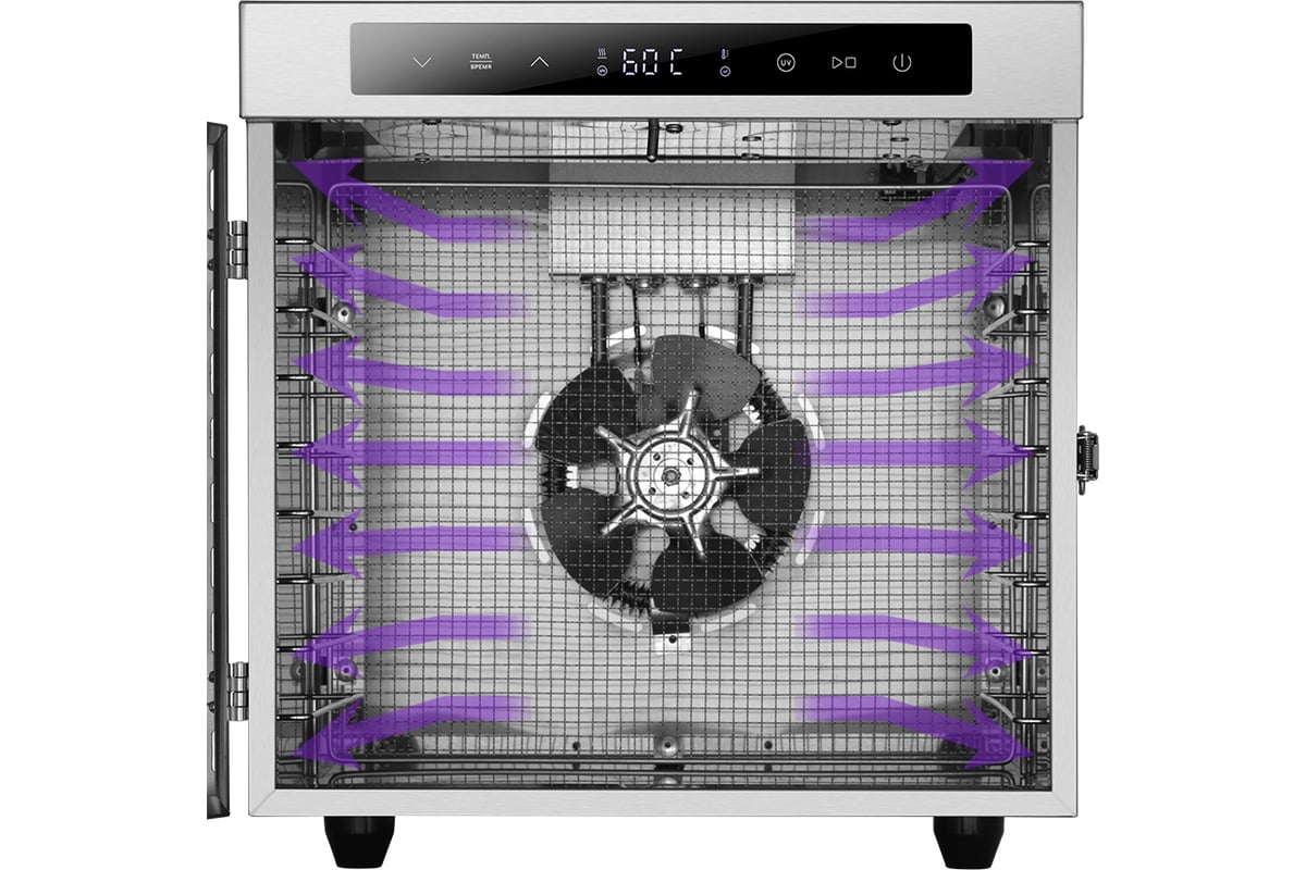 В сушилке установлен нагревательный элемент, а также вентилятор, обеспечивающий равномерное распределение нагретого воздуха по всему объему камеры. Благодаря горизонтальному обдуву смешение запахов при одновременной сушке разных продуктов минимально.