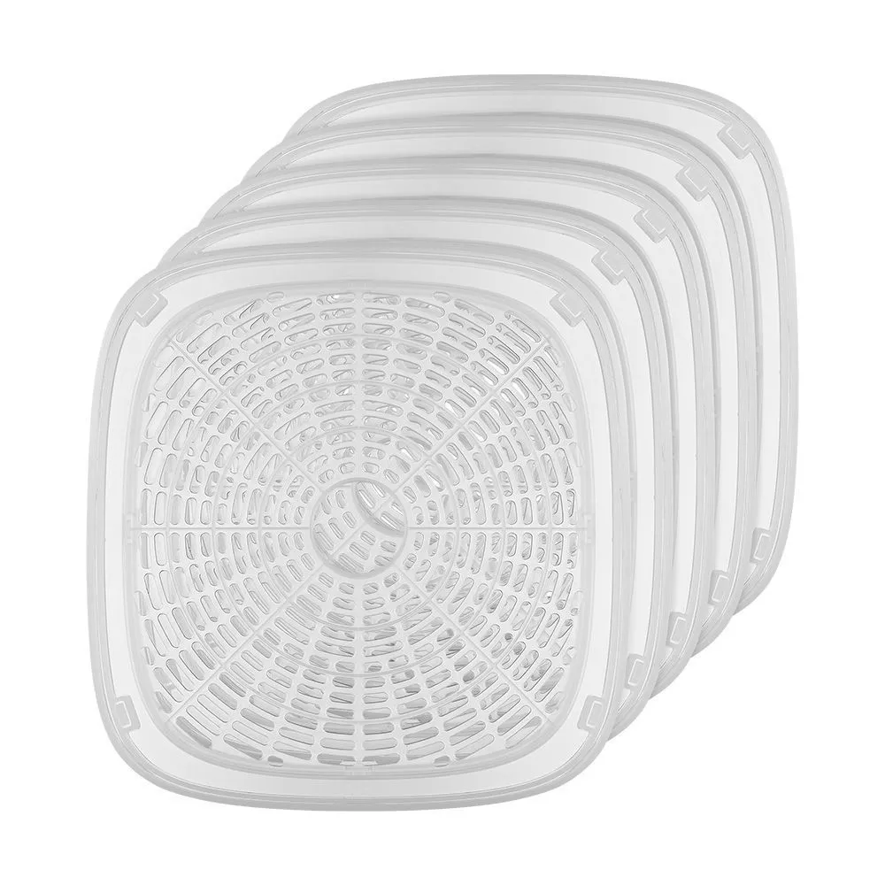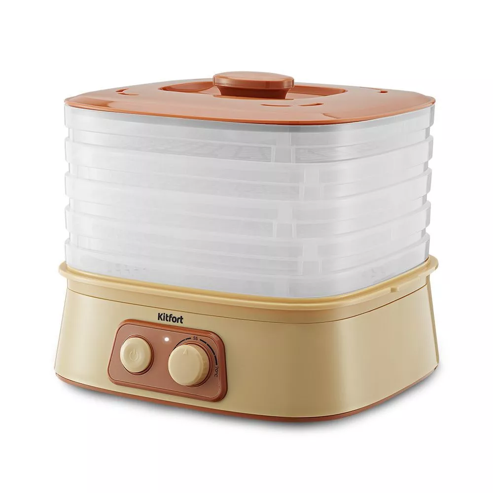 Сушилка Kitfort KT-1990 имеет в комплекте 5 поддонов из прозрачного пластика, вы можете регулировать их по высоте благодаря специальным выступам.