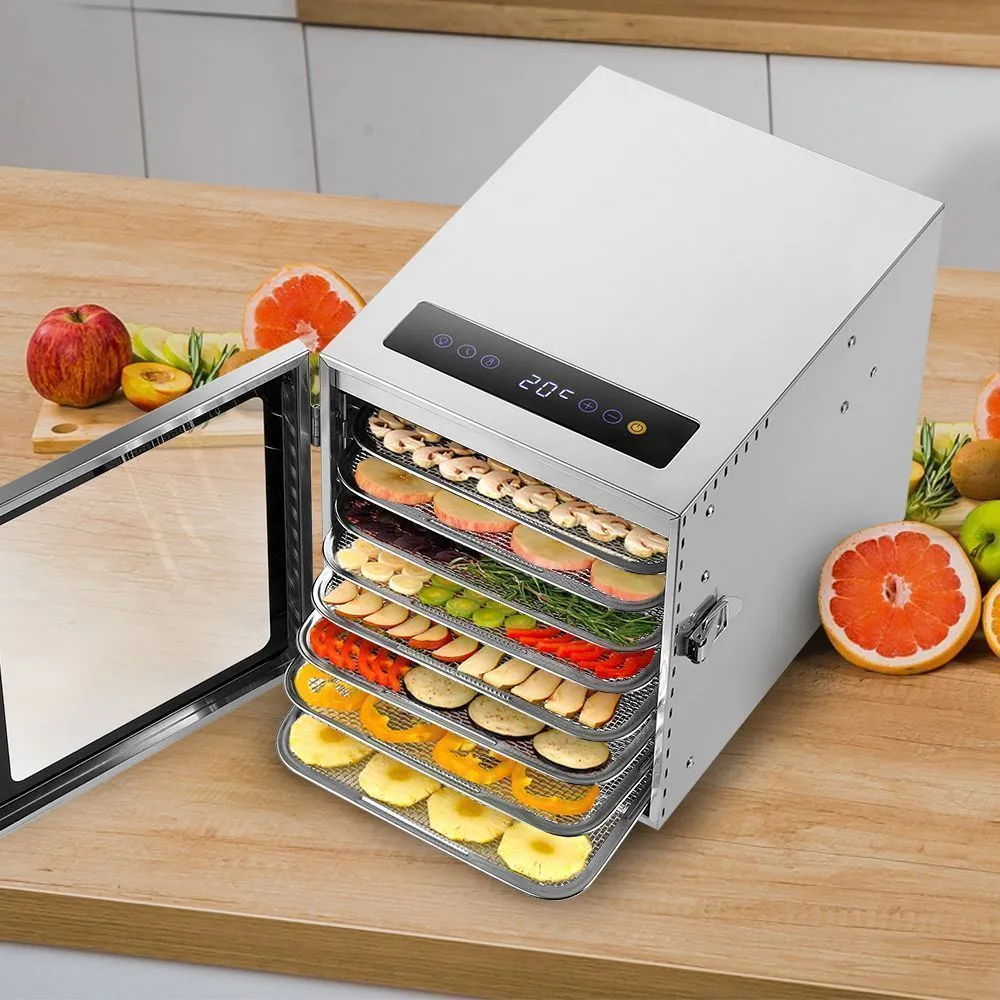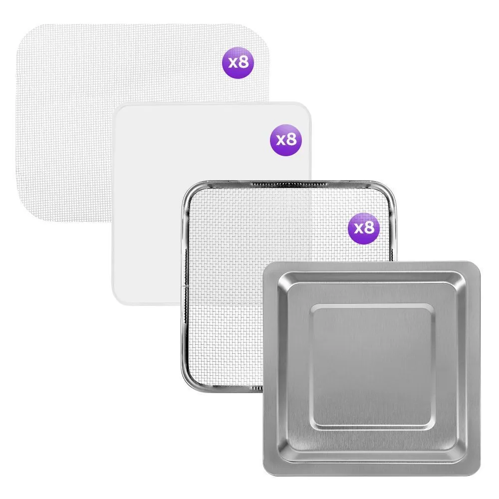 Металлические поддоны подходят для большинства типов продуктов. Сетки используются для небольших продуктов. Силиконовые сплошные поддоны применяются для сушки водянистых фруктов и овощей. Поддон для жидкости служит защитой от загрязнений сушилки.