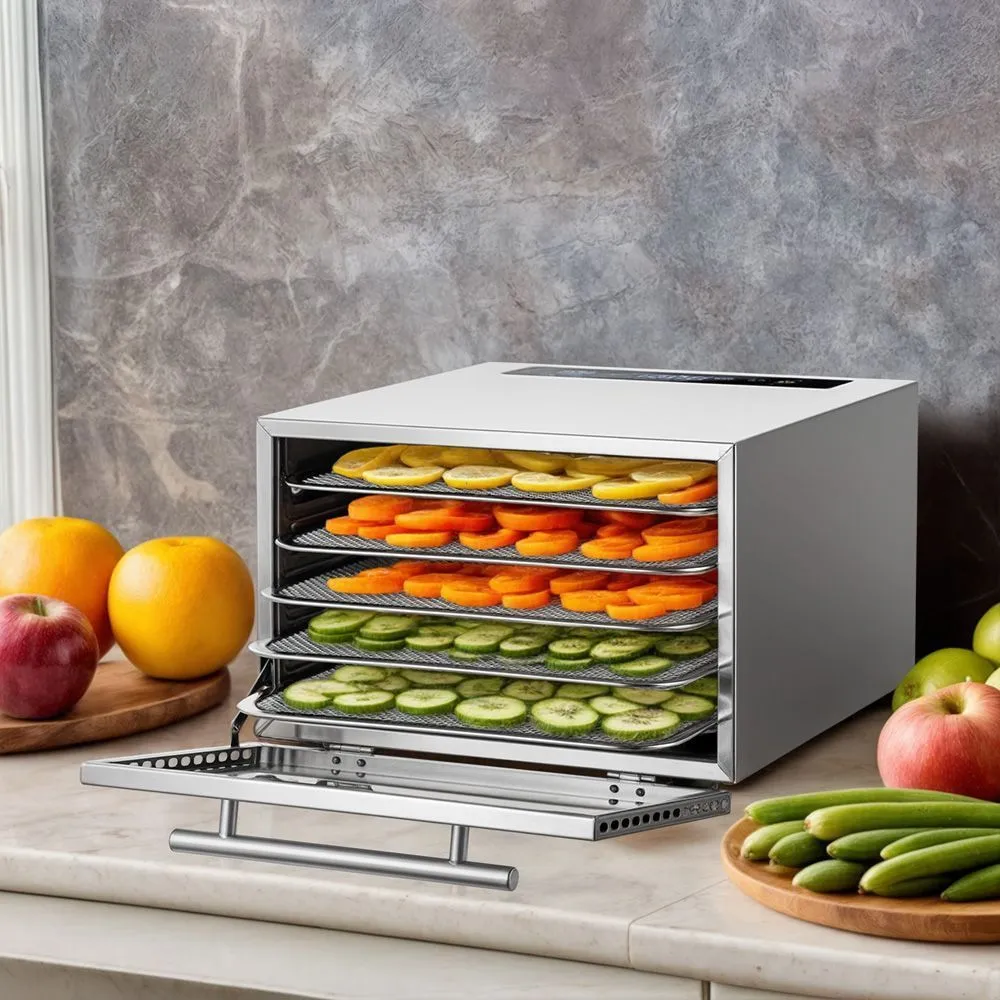 На сушилке можно устанавливать температуру сушки в диапазоне 20-90°C с шагом 5 градусов. Сушилка также оснащена таймером до 24 часов с шагом 30 минут. Для вашего удобства необходимые время и температуру сушки различных продуктов указаны в инструкции.