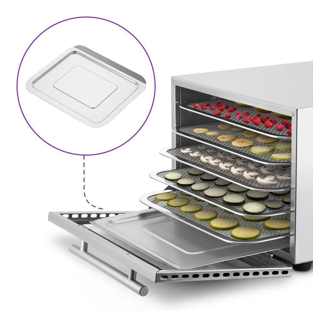 В комплекте к сушилке идут: 5 металлических сетчатых поддонов для сушки фруктов, овощей, мяса; 5 пластиковых сетчатых поддонов для сушки небольших продуктов (травы и ягоды); пластиковых сплошных поддонов для сушки водянистых продуктов и пастилы.