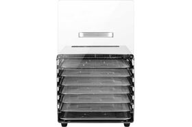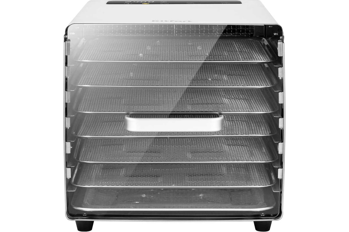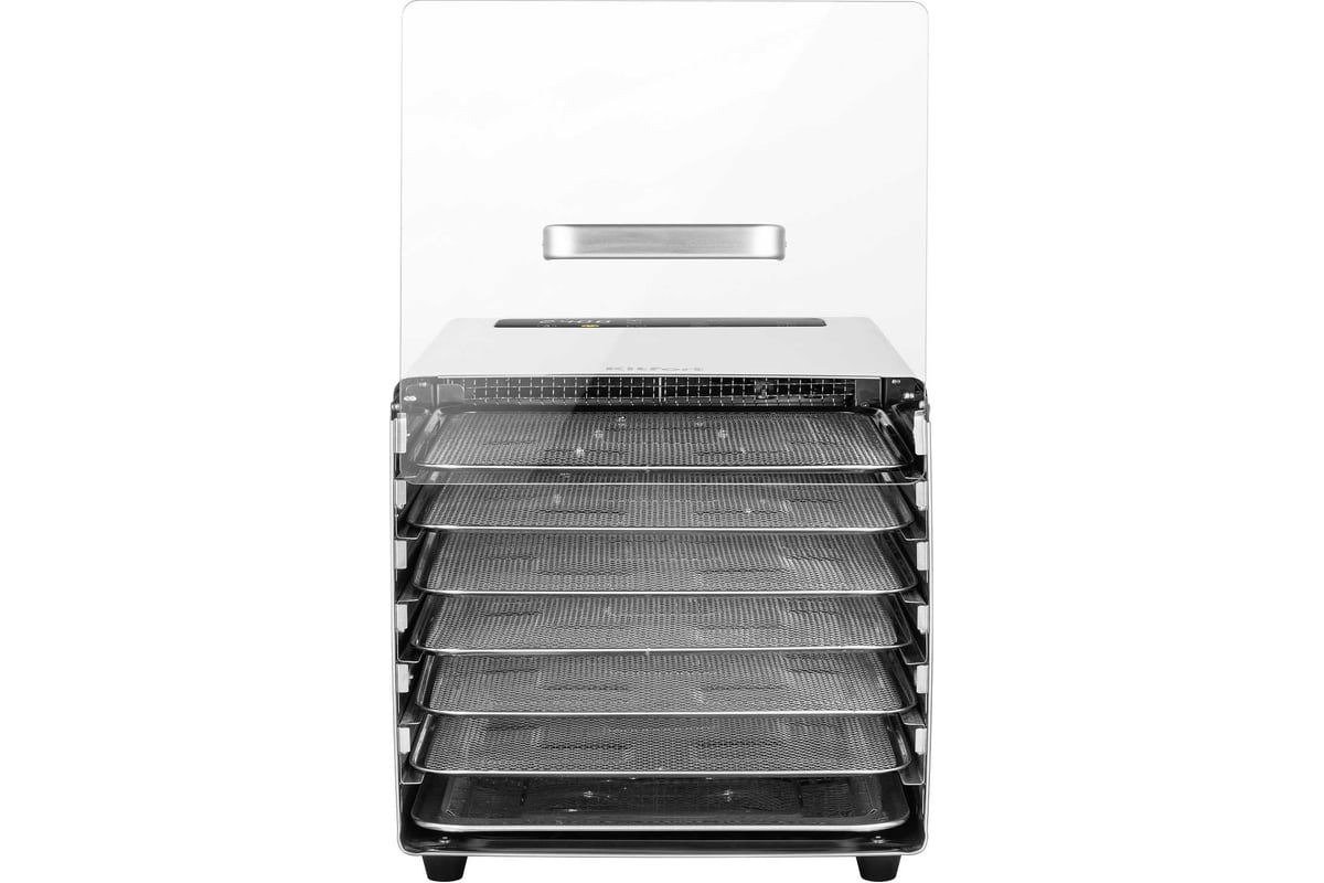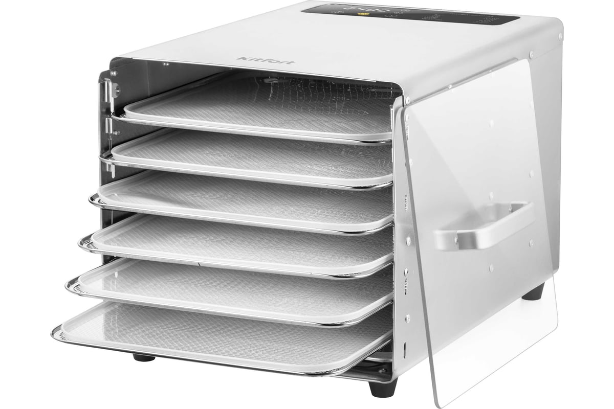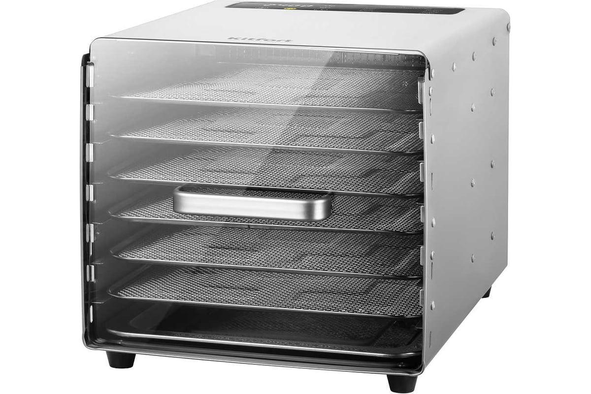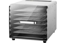 Сушилка имеет в комплекте 6 металлических поддонов, 6 сеток для мелких продуктов и 6 силиконовых сплошных поддонов. Также в комплект входит 1 поддон для жидкости, который облегчает очистку устройства: на поддон попадают остатки от продуктов и сок, после чего поддон легко достать и очистить, а дно камеры сушилки остается чистым.