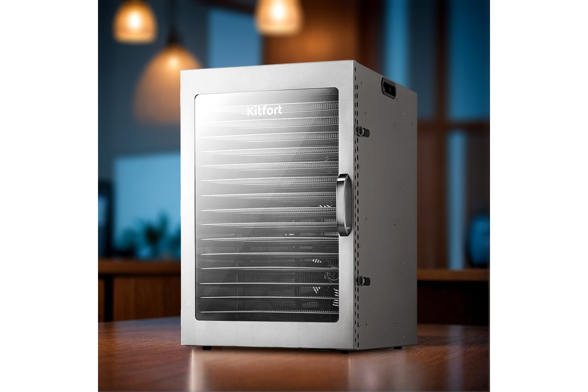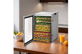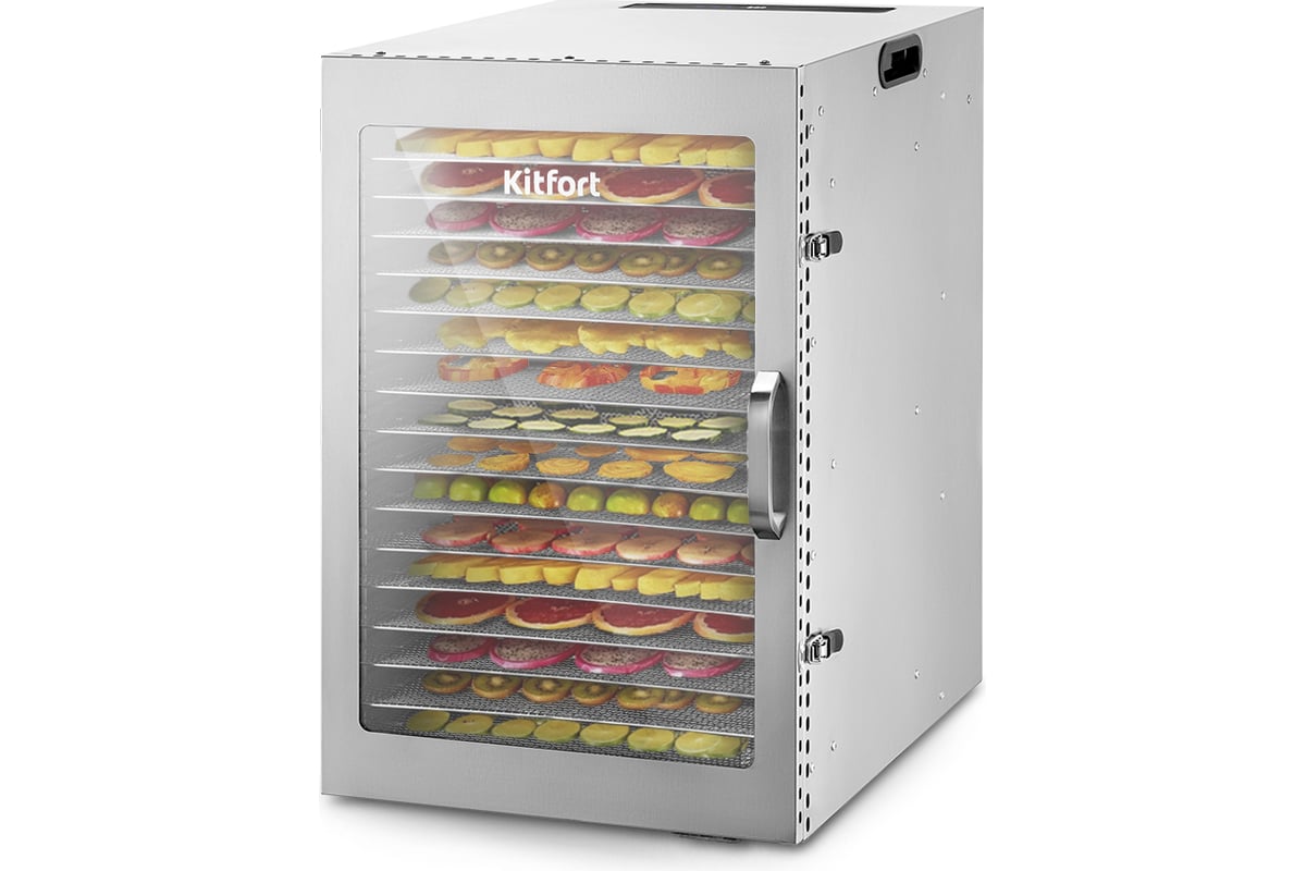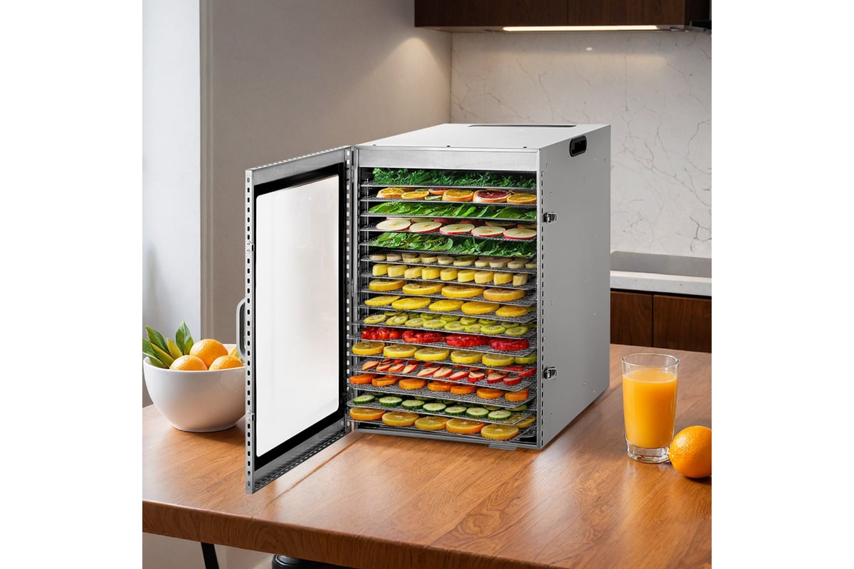 Сушилка имеет в комплекте 16 металлических поддонов, 16 сеток для мелких продуктов и 16 силиконовых сплошных поддонов. Также в комплект входит 1 поддон для жидкости, который облегчает очистку устройства: на поддон попадают остатки от продуктов и сок, после чего поддон легко достать и очистить, а дно камеры сушилки остается чистым.