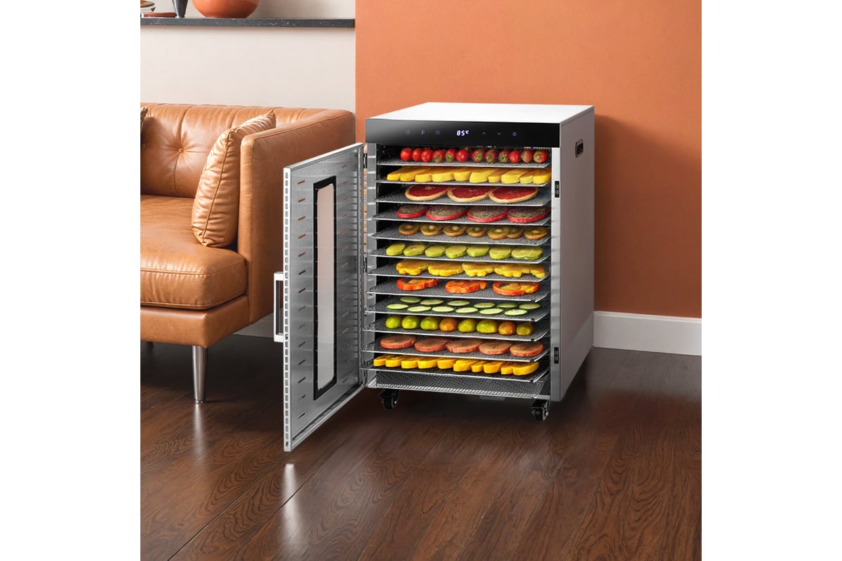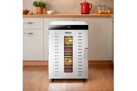 Сушилка имеет в комплекте 16 металлических поддонов, 16 сеток для мелких продуктов и 16 силиконовых сплошных поддонов. Также в комплект входит 1 поддон для жидкости, который облегчает очистку устройства: на поддон попадают остатки от продуктов и сок, после чего поддон легко достать и очистить, а дно камеры сушилки остается чистым.