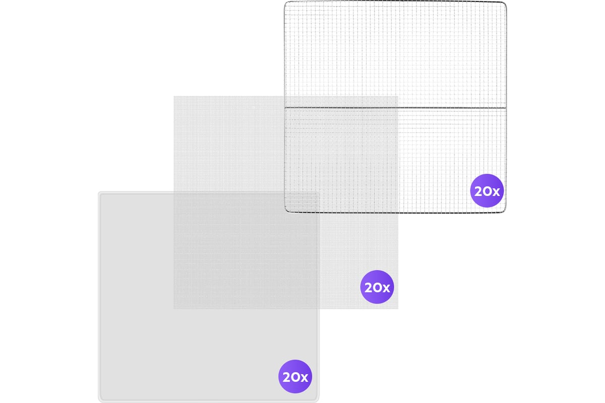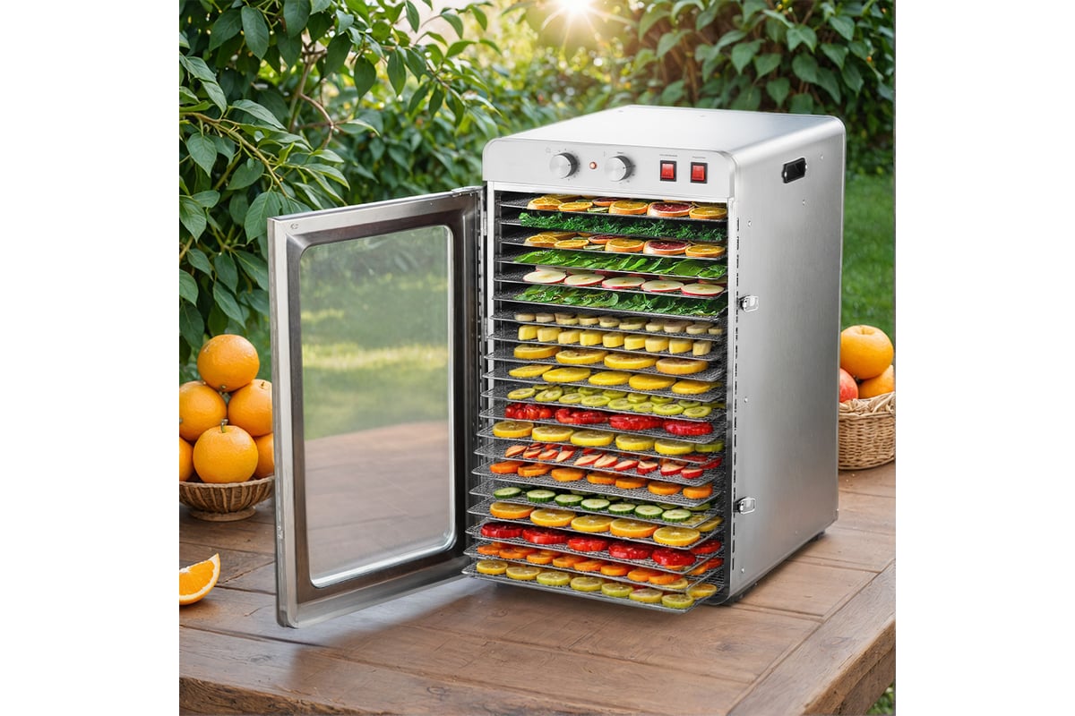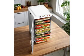 Сушилка имеет в комплекте 20 металлических сетчатых поддонов, 20 силиконовых сплошных поддонов и 20 сеток.Температуру сушки можно изменить от 30 до 90 °С. Сушилка оснащена таймером до 12 часов работы.Также в сушилке есть подсветка, благодаря которой вы сможете наблюдать за процессом сушки.