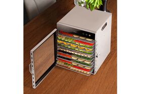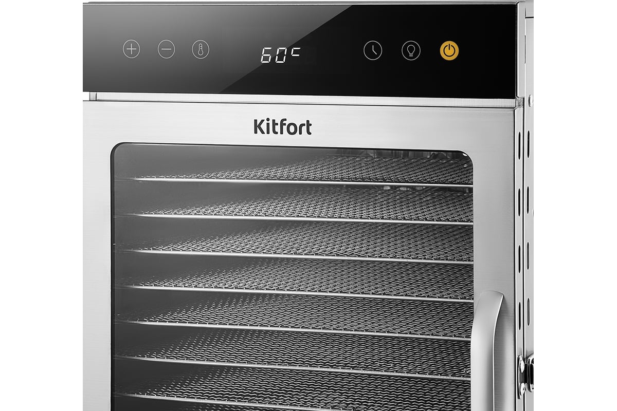 В сушилку установлен мощный нагревательный элемент и вентилятор, обеспечивающий равномерное распределение нагретого воздуха по всему объему камеры. Благодаря горизонтальному обдуву смешение запахов при одновременной сушке разных продуктов минимально. Вы можете включить подсветку внутри камеры.