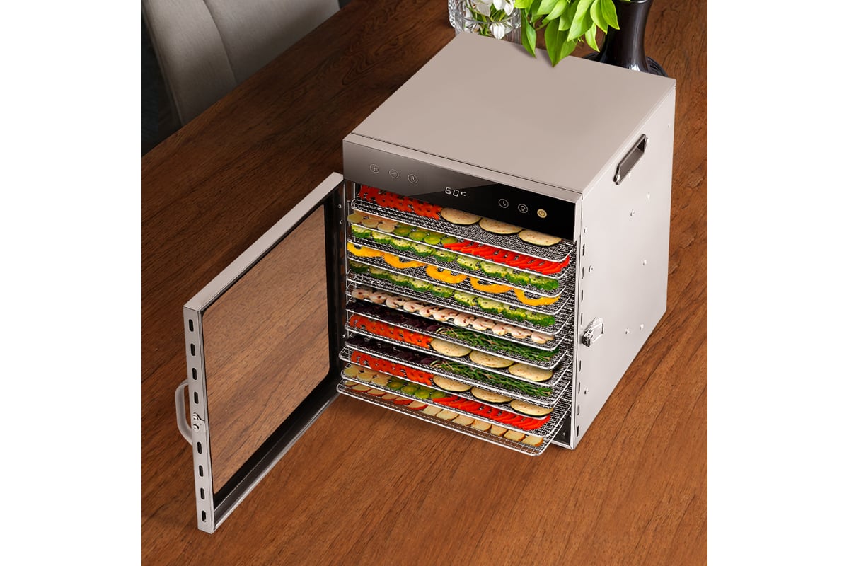Сушилка имеет в комплекте 12 металлических поддонов, 12 силиконовых сплошных поддонов и 12 сеток.