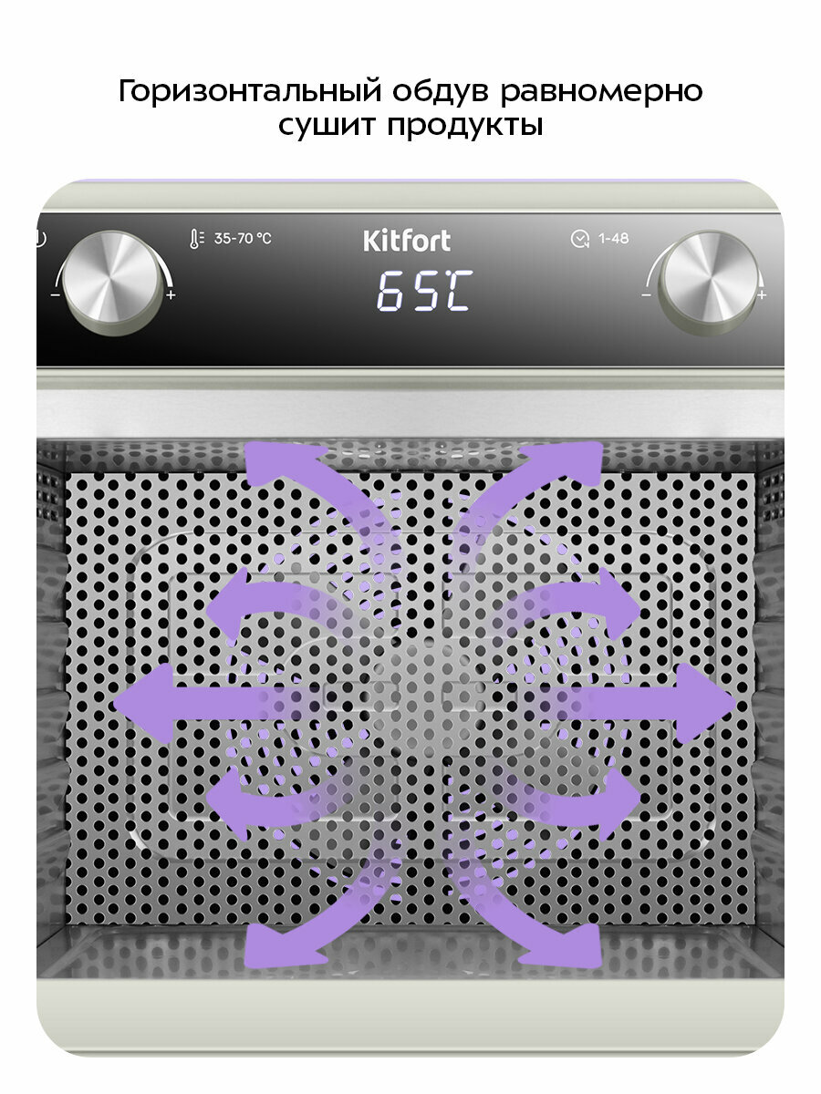 На сушилке КТ-4951 можно установить температуру в диапазоне от 35 до 70°C с шагом в 1°C. Также сушилка оснащена таймером от 1 до 48 часов работы с шагом в 1 час.