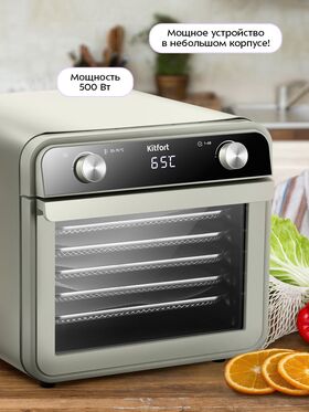 Мощность сушилки достигает 500 Вт - этого достаточно для создания вкусных снеков в большом количестве. Сушилка идеальная для заготовки перекуса в дорогу – высушенные фрукты приобретут новый вкус и не займут много места.