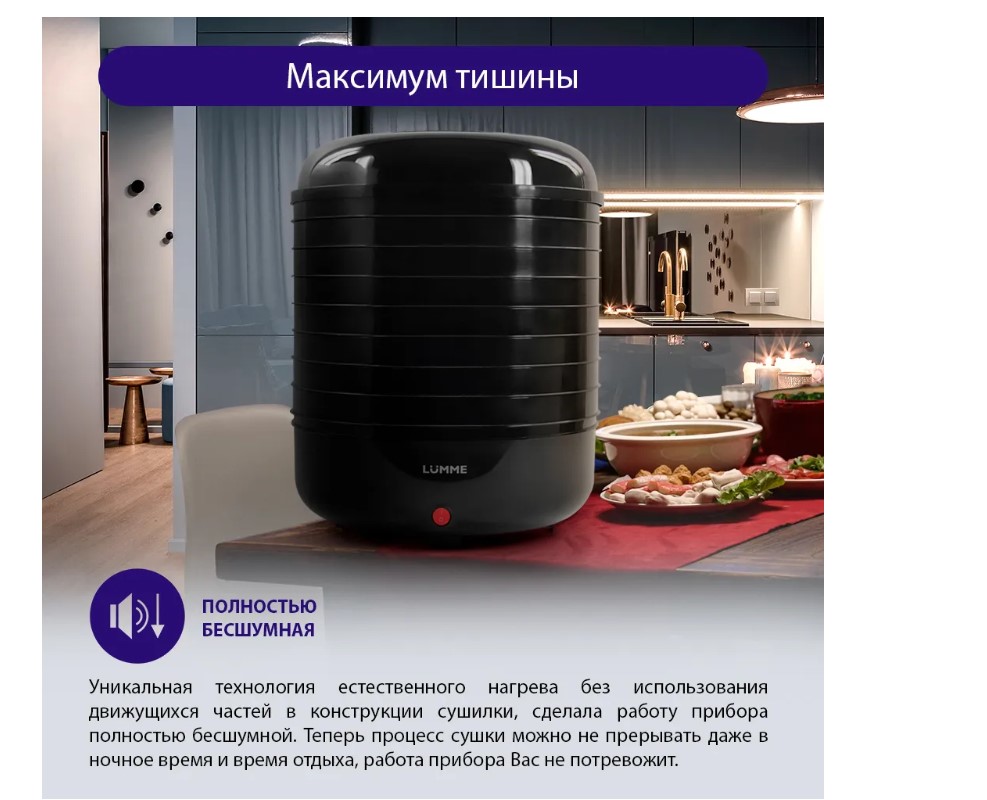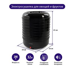 Восьмиуровневая электросушилка с тремя дополнительными поддонами для равномерной сушки трав, зелени, овощей, фруктов, орехов, грибов, приготовления вяленого мяса, птицы, рыбы. Корпус и поддоны сушилки изготовлены из пищевого термостойкого пластика, устойчивого к высоким температурам, не выделяющего вредных веществ и посторонних запахов, сохраняющего вкус и аромат продуктов натуральными. Многоярусная конструкция электросушилки позволяет разместить в небольшом объеме максимум продуктов и добиться их наилучшего распределения для быстрого и равномерного высушивания. Бесшумная работа электросушилки не нарушит домашнего комфорта, а энергосберегающий режим позволит при этом сэкономить электроэнергию. Электросушилка – необычайно полезный прибор, поскольку способен на долгое время сохранить питательную ценность многих сезонных продуктов, обеспечив здоровое питание на весь год.