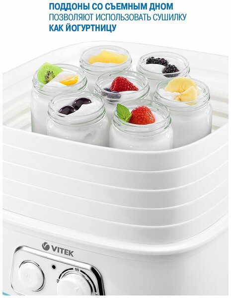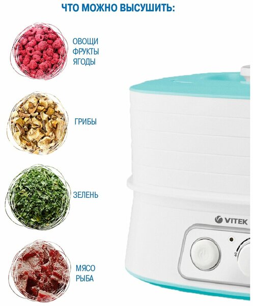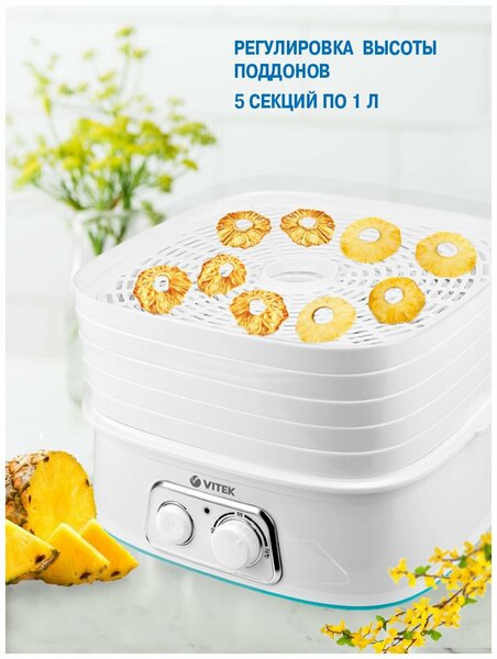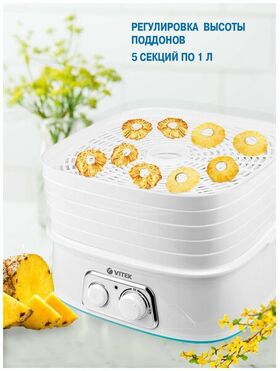 Сушилка для овощей VITEK VT-5053 W хорошо впишется в интерьер вашей кухни за счет небольших размеров. Изготовлена из пластика, имеет 5 секций по 1 л. Вы можете выбрать нужный режим с помощью поворотных ручек.